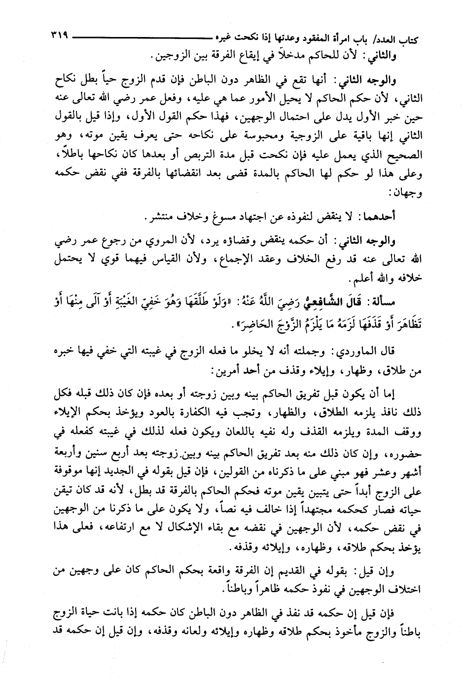 إِمَّا أَنْ يَكُونَ قَبْلَ تَفْرِيقِ الْحَاكِمِ بَيْنَهُ وَبَيْنَ زَوْجَتِهِ أَوْ بَعْدَهُ فَإِنْ كَانَ ذَلِكَ قَبْلَهُ فَكُلُّ ذلك نافد يَلْزَمُهُ الطَّلَاقُ، وَالظِّهَارُ، وَتَجِبُ فِيهِ الْكَفَّارَةُ بِالْعَوْدِ وَيُؤْخَذُ بِحُكْمِ الْإِيلَاءِ وَوَقْفِ الْمُدَّةِ وَيَلْزَمُهُ الْقَذْفُ وَلَهُ نَفْيُهُ بِاللِّعَانِ وَيَكُونُ فِعْلُهُ لِذَلِكَ فِي غَيْبَتِهِ كَفِعْلِهِ فِي حُضُورِهِ، وَإِنْ كَانَ ذَلِكَ مِنْهُ بَعْدَ تَفْرِيقِ الْحَاكِمِ بَيْنِهِ وَبَيْنَ زَوْجَتِهِ بَعْدَ أَرْبَعِ سِنِينَ وَأَرْبَعَةِ أَشْهُرٍ وَعَشْرٍ فَهُوَ مَبْنِيٌّ عَلَى مَا ذَكَرْنَاهُ مِنَ الْقَوْلَيْنِ، فَإِنْ قِيلَ بِقَوْلِهِ فِي الْجَدِيدِ إِنَّهَا مَوْقُوفَةٌ عَلَى الزَّوْجِ أَبَدًا حَتَّى يَتَبَيَّنَ يَقِينُ مَوْتِهِ فَحُكْمُ الْحَاكِمِ بِالْفُرْقَةِ قَدْ بَطَلَ، لِأَنَّهُ قَدْ كَانَ تَيَقَّنَ حَيَاتَهُ فَصَارَ كَحُكْمِهِ، مُجْتَهِدًا إِذَا خَالَفَ فِيهِ نَصًّا، وَلَا يَكُونُ عَلَى مَا ذَكَرْنَا مِنَ الْوَجْهَيْنِ فِي نَقْضِ حُكْمِهِ، لِأَنَّ الْوَجْهَيْنِ فِي نَقْضِهِ مَعَ بَقَاءِ الْإِشْكَالِ لَا مَعَ ارْتِفَاعِهِ، فَعَلَى هَذَا يُؤْخَذُ بِحُكْمِ طَلَاقِهِ، وَظِهَارِهِ، وَإِيلَائِهِ، وَقَذْفِهِ. وَإِنْ قِيلَ: بِقَوْلِهِ فِي الْقَدِيمِ إِنَّ الْفُرْقَةَ وَاقِعَةٌ بِحُكْمِ الْحَاكِمِ كَانَ عَلَى وَجْهَيْنِ مِنِ اخْتِلَافِ الْوَجْهَيْنِ فِي نُفُوذِ حُكْمِهِ ظَاهِرًا وَبَاطِنًا.
