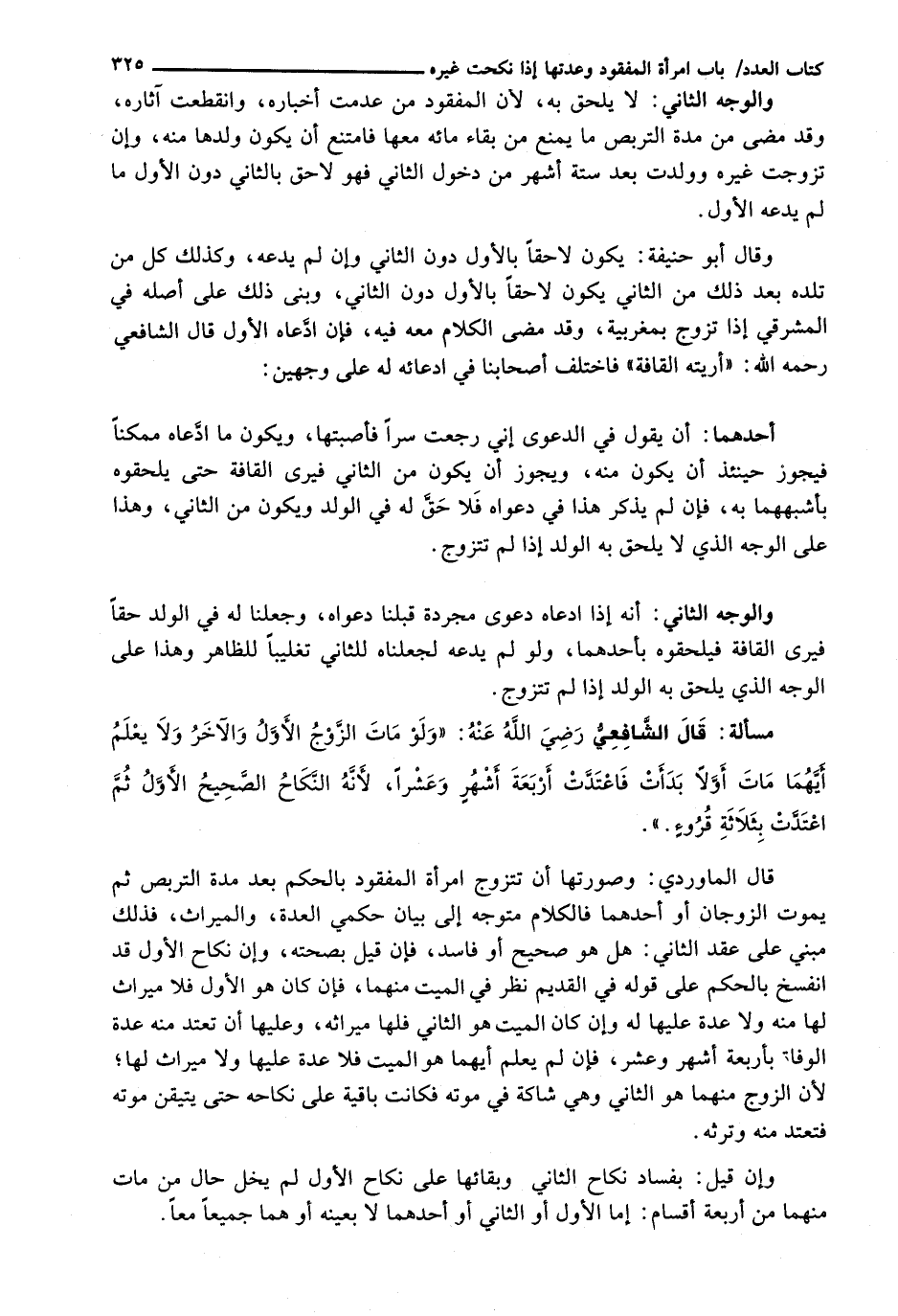 قَالَ الْمَاوَرْدِيُّ: وَصُورَتُهَا أَنْ تَتَزَوَّجَ امْرَأَةُ الْمَفْقُودِ بِالْحُكْمِ بَعْدَ مُدَّةِ التَّرَبُّصِ ثُمَّ يَمُوتُ الزَّوْجَانِ أَوْ أَحَدُهُمَا فَالْكَلَامُ مُتَوَجِّهٌ إِلَى بَيَانِ حُكْمَيِ الْعِدَّةِ، وَالْمِيرَاثِ، فَذَلِكَ مَبْنِيٌّ عَلَى عَقْدِ الثَّانِي: هَلْ هُوَ صَحِيحٌ أَوْ فَاسِدٌ، فَإِنْ قِيلَ بِصِحَّتِهِ، وَإنَّ نِكَاحَ الْأَوَّلِ قَدِ انْفَسَخَ بِالْحُكْمِ عَلَى قَوْلِهِ فِي الْقَدِيمِ نُظِرَ فِي الْمَيِّتِ مِنْهُمَا، فَإِنْ كَانَ هُوَ الْأَوَّلَ فَلَا مِيرَاثَ لَهَا مِنْهُ وَلَا عِدَّةَ عَلَيْهَا لَهُ وَإِنْ كَانَ الْمَيِّتُ هُوَ الثَّانِيَ فَلَهَا مِيرَاثُهُ، وَعَلَيْهَا أَنْ تَعْتَدَّ مِنْهُ عِدَّةَ الْوَفَاةِ بِأَرْبَعَةِ أَشْهُرٍ وَعَشْرٍ، فَإِنْ لَمْ يُعْلَمْ أَيُّهُمَا هُوَ الْمَيِّتُ فَلَا عِدَّةَ عَلَيْهَا وَلَا مِيرَاثَ لَهَا؛ لِأَنَّ الزَّوْجَ مِنْهُمَا هُوَ الثَّانِي وَهِيَ شَاكَّةٌ فِي مَوْتِهِ فَكَانَتْ بَاقِيَةً عَلَى نِكَاحِهِ حَتَّى يُتَيَقَّنَ مَوْتُهُ فَتَعْتَدَّ مِنْهُ وَتَرِثَهُ.