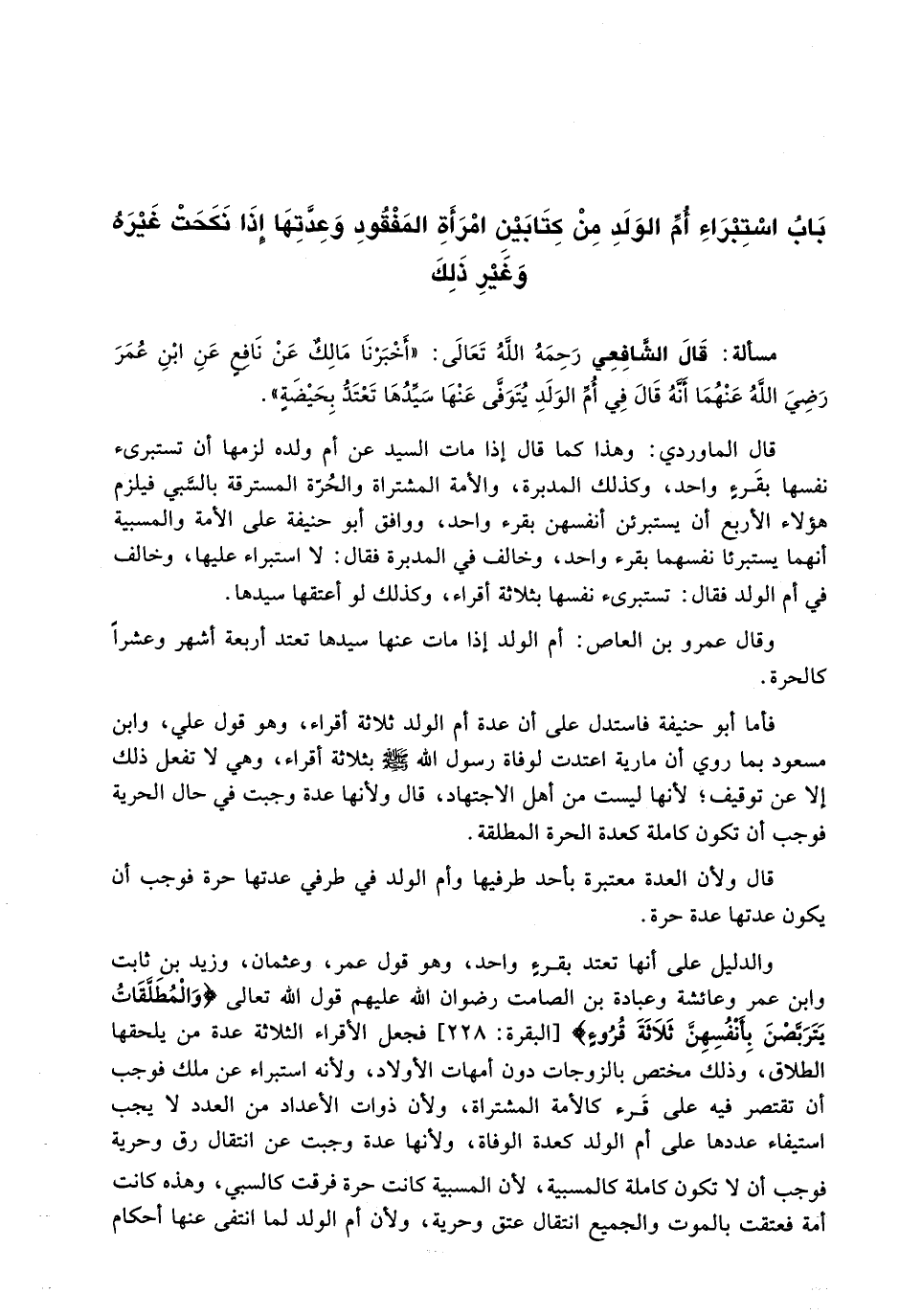 قَالَ الشَّافِعِيُّ رَحِمَهُ اللَّهُ تَعَالَى: " أَخْبَرَنَا مَالِكٌ عَنْ نَافِعٍ عَنِ ابْنِ عُمَرَ رَضِيَ اللَّهُ عَنْهُمَا أَنَّهُ قَالَ فِي أُمِّ الْوَلَدِ يُتَوَفَّى عَنْهَا سَيِّدُهَا تَعْتَدُّ بِحَيْضَةٍ ".