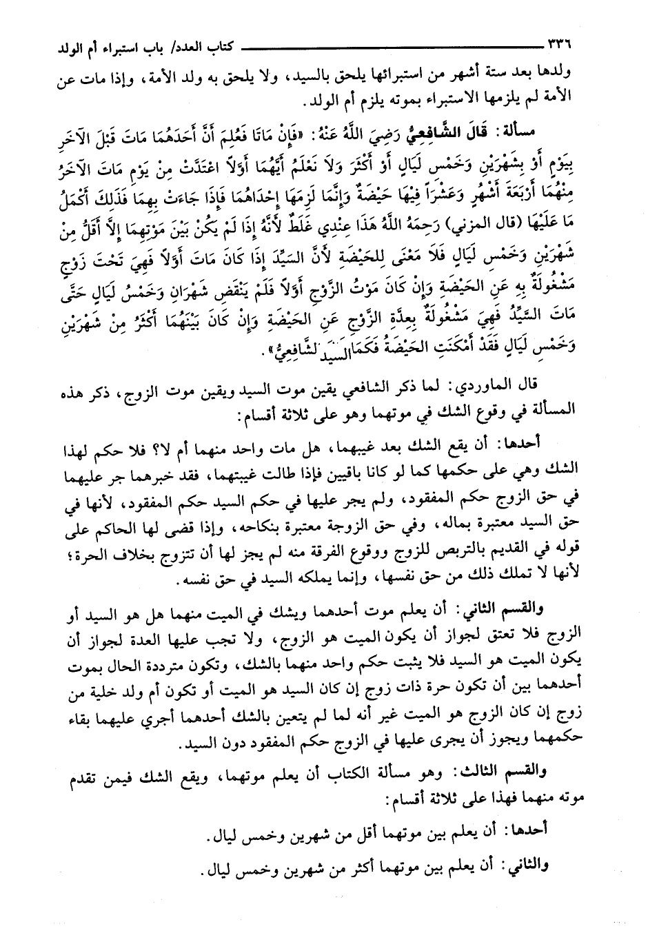 قَالَ الْمَاوَرْدِيُّ: لَمَّا ذَكَرَ الشَّافِعِيُّ يَقِينَ مَوْتِ السَّيِّدِ وَيَقِينَ مَوْتِ الزَّوْجِ، ذَكَرَ هَذِهِ الْمَسْأَلَةَ فِي وُقُوعِ الشَّكِّ فِي مَوْتِهِمَا وَهُوَ عَلَى ثَلَاثَةِ أَقْسَامٍ: