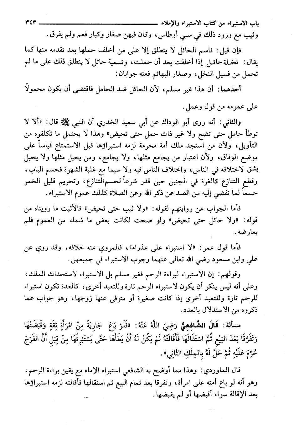 وَالثَّانِي: أَنَّهُ رَوَى أَبُو الْوَدَّاكِ عَنْ أَبِي سَعِيدٍ الْخُدْرِيِّ أَنَّ النَّبِيَّ - صَلَّى اللَّهُ عَلَيْهِ وَسَلَّم َ - قَالَ: " أَلَا لَا تُوطَأُ حَامِلٌ حَتَّى تَضَعَ وَلَا غَيْرُ ذَاتِ حَمْلٍ حَتَّى تَحِيضَ " وَهَذَا لَا يَحْتَمِلُ مَا تَكَلَّفُوهُ مِنَ التَّأْوِيلِ، وَلِأَنَّ مَنِ اسْتَجَدَّ مِلْكَ أَمَةٍ مُحَرَّمَةٍ لَزِمَهُ اسْتِبْرَاؤُهَا قَبْلَ الِاسْتِمْتَاعِ قِيَاسًا عَلَى مَوْضِعِ الْوِفَاقِ، وَلِأَنَّ اعْتِبَارَ مَنْ يُجَامَعُ مِثْلُهَا، وَلَا يُجَامَعُ، وَمَنْ يَحْبَلُ مِثْلُهَا وَلَا يَحْبَلُ يَشُقُّ لِاخْتِلَافِهِ فِي النَّاسِ، وَاخْتِلَافِ النَّاسِ فِيهِ وَلَا سِيَّمَا مَعَ غَلَبَةِ الشَّهْوَةِ فَحُسِمَ الْبَابُ، وَقُطِعَ التَّنَازُعُ كَالْغُرَّةِ فِي الْجَنِينِ حِينَ قُدِّرَ شَرْعًا لِحَسْمِ التَّنَازُعِ، وَتَحْرِيمِ قَلِيلِ الْخَمْرِ حَسْمًا لِمَا تُفْضِي إِلَيْهِ مِنَ الصَّدِّ عَنْ ذِكْرِ اللَّهِ وَعَنِ الصَّلَاةِ كَذَلِكَ عُمُومُ الِاسْتِبْرَاءِ.