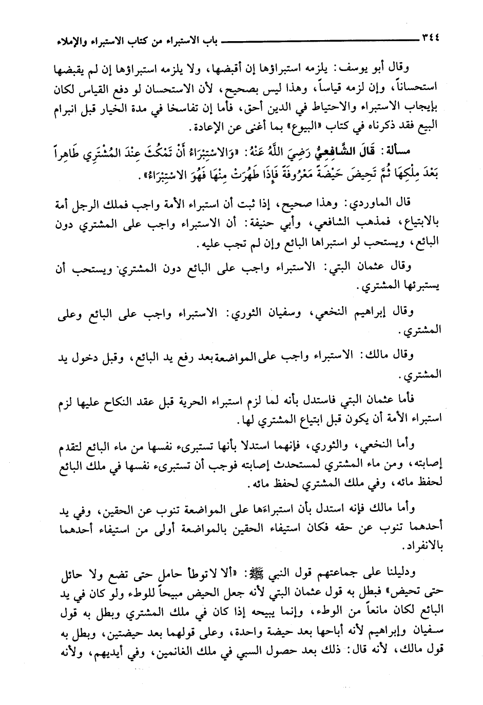وَدَلِيلُنَا عَلَى جَمَاعَتِهِمْ قَوْلُ النَّبِيِّ - صَلَّى اللَّهُ عَلَيْهِ وَسَلَّم َ -: " أَلَا لَا تُوطَأُ حَامِلٌ حَتَّى تَضَعَ وَلَا حَائِلٌ حَتَّى تَحِيضَ " فَبَطَلَ بِهِ قَوْلُ عُثْمَانَ الْبَتِّيِّ لِأَنَّهُ جَعَلَ الْحَيْضَ مُبِيحًا لِلْوَطْءِ وَلَوْ كَانَ فِي يَدِ الْبَائِعِ لَكَانَ مَانِعًا مِنَ الْوَطْءِ، وَإِنَّمَا يُبِيحُهُ إِذَا كَانَ فِي مِلْكِ الْمُشْتَرِي وَبَطَلَ بِهِ قَوْلُ سُفْيَانَ وَإِبْرَاهِيمَ لِأَنَّهُ أَبَاحَهَا بَعْدَ حَيْضَةٍ وَاحِدَةٍ، وَعَلَى قَوْلِهِمَا بَعْدَ حَيْضَتَيْنِ، وَبَطَلَ بِهِ قَوْلُ مَالِكٍ، لِأَنَّهُ قَالَ: ذَلِكَ بَعْدَ حُصُولِ السَّبْيِ فِي مِلْكِ الْغَانِمِينَ، وَفِي أَيْدِيهِمْ، وَلِأَنَّهُ