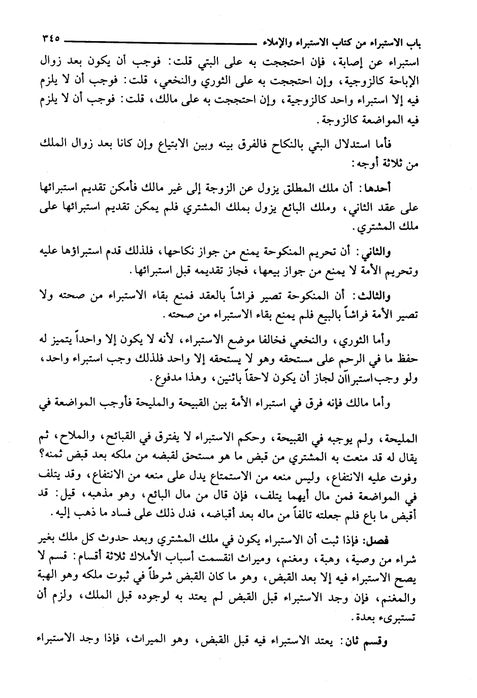 فَإِذَا ثَبَتَ أَنَّ الِاسْتِبْرَاءَ يَكُونُ فِي مِلْكِ الْمُشْتَرِي وَبَعْدَ حُدُوثِ كُلِّ مِلْكٍ بِغَيْرِ شِرَاءٍ مِنْ وَصِيَّةٍ، وَهِبَةٍ، وَمَغْنَمٍ، وَمِيرَاثٍ انْقَسَمَتْ أَسْبَابُ الْأَمْلَاكِ ثلاثة أقسام: قسم لا نصح الِاسْتِبْرَاءُ، فِيهِ إِلَّا بَعْدَ الْقَبْضِ، وَهُوَ مَا كَانَ الْقَبْضُ شَرْطًا فِي ثُبُوتِ مِلْكِهِ وَهُوَ الْهِبَةُ وَالْمَغْنَمُ، فَإِنْ وُجِدَ الِاسْتِبْرَاءُ قَبْلَ الْقَبْضِ لَمْ يُعْتَدَّ بِهِ لِوُجُودِهِ قَبْلَ الْمِلْكِ، وَلَزِمَ أَنْ تَسْتَبْرِئَ بَعْدَهُ.
