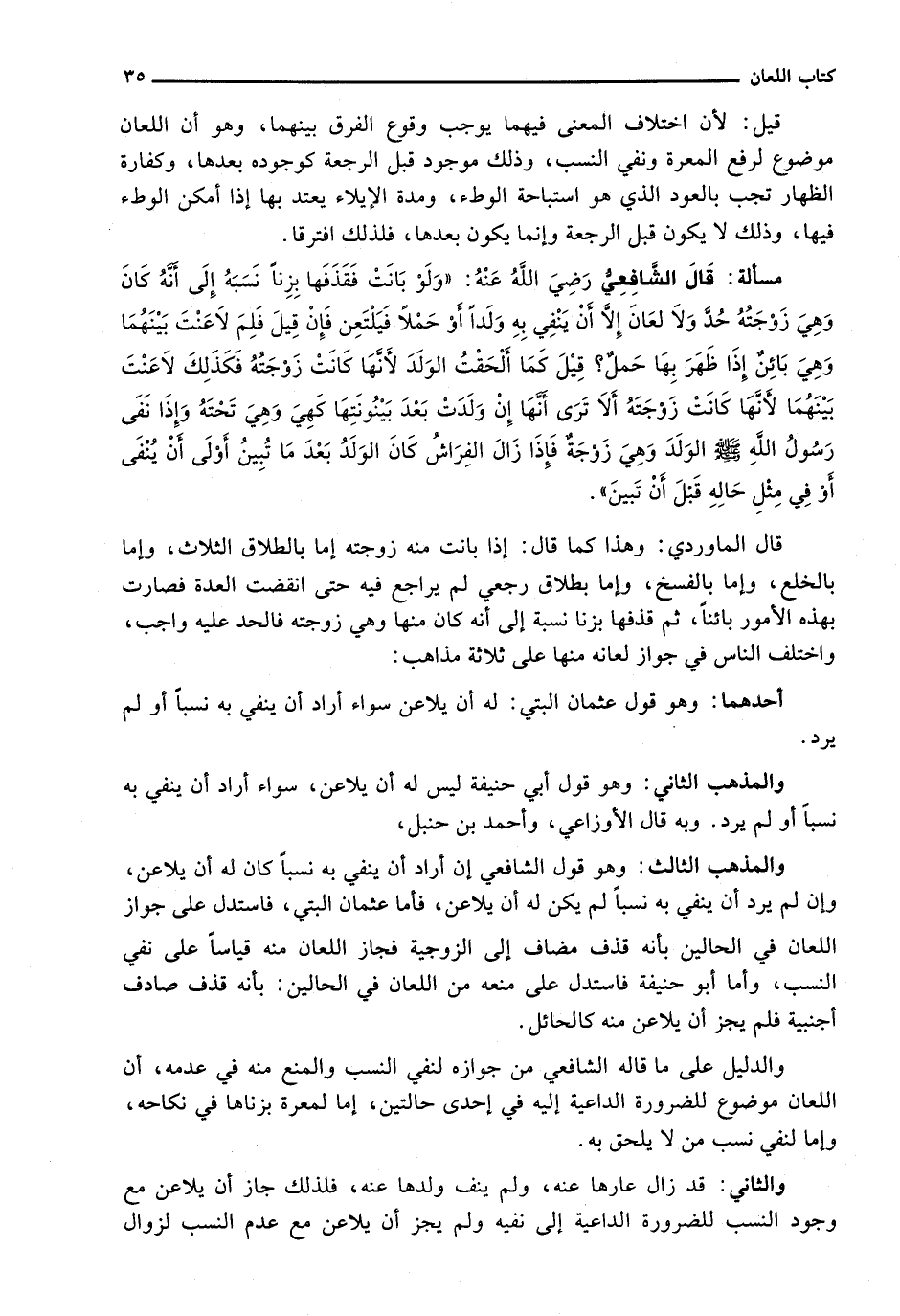 وَالْمَذْهَبُ الثَّالِثُ: وَهُوَ قَوْلُ الشَّافِعِيِّ إِنْ أَرَادَ أَنْ يَنْفِيَ بِهِ نَسَبًا كَانَ لَهُ أَنْ يُلَاعِنَ، إن لَمْ يُرِدْ أَنْ يَنْفِيَ بِهِ نَسَبًا لَمْ يَكُنْ لَهُ أَنْ يُلَاعِنَ، فَأَمَّا عُثْمَانُ الْبَتِّيُّ، فَاسْتَدَلَّ عَلَى جَوَازِ اللِّعَانِ فِي الْحَالَيْنِ بِأَنَّهُ قَذْفٌ مُضَافٌ إِلَى الزَّوْجِيَّةِ فَجَازَ اللِّعَانُ مِنْهُ قِيَاسًا عَلَى نَفْيِ النَّسَبِ، وَأَمَّا أَبُو حَنِيفَةَ فَاسْتَدَلَّ عَلَى مَنْعِهِ مِنَ اللِّعَانِ فِي الْحَالَيْنِ: بِأَنَّهُ قَذْفٌ صَادَفَ أَجْنَبِيَّةً فَلَمْ يَجُزْ أَنْ يُلَاعِنَ مِنْهُ كَالْحَائِلِ.
