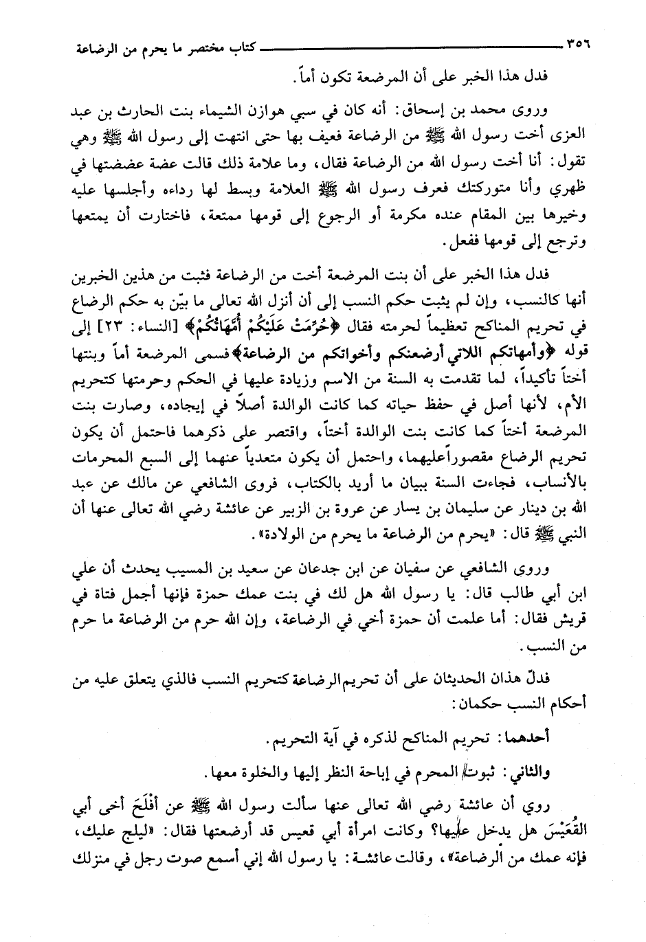 فَدَلَّ هَذَا الْخَبَرُ عَلَى أَنَّ بِنْتَ الْمُرْضِعَةِ أُخْتٌ مِنَ الرَّضَاعَةِ فَثَبَتَ مِنْ هَذَيْنِ الْخَبِرَيْنِ أَنَّهَا كَالنَّسَبِ، وَإِنْ لَمْ يَثْبُتْ حُكْمُ النَّسَبِ إِلَى أَنْ أَنْزَلَ اللَّهُ تَعَالَى مَا بَيَّنَ بِهِ حُكْمَ الرَّضَاعِ فِي تَحْرِيمِ الْمَنَاكِحِ تَعْظِيمًا لِحُرْمَتِهِ فَقَالَ {حُرِّمَتْ عَلَيْكُمْ أُمَّهَاتُكُمْ} [النساء: 23] إِلَى قَوْلِهِ {وَأُمَّهَاتُكُمُ اللاتِي أَرْضَعْنَكُمْ وَأَخَوَاتُكُمْ من الرضاعة} فَسَمَّى الْمُرْضِعَةَ أُمًّا وَبِنْتَهَا أُخْتًا تَأْكِيدًا، لِمَا تَقَدَّمَتْ بِهِ السُّنَّةُ مِنَ الِاسْمِ وَزِيَادَةً عَلَيْهَا فِي الْحُكْمِ وَحُرْمَتُهَا كَتَحْرِيمِ الْأُمِّ، لِأَنَّهَا أَصْلٌ فِي حِفْظِ حَيَاتِهِ كَمَا كَانَتِ الْوَالِدَةُ أَصْلًا فِي إِيجَادِهِ، وَصَارَتْ بِنْتُ الْمُرْضِعَةِ أُخْتًا كَمَا كَانَتْ بِنْتُ الْوَالِدَةِ أُخْتًا، وَاقْتَصَرَ عَلَى ذِكْرِهِمَا فَاحْتَمَلَ أَنْ يَكُونَ تَحْرِيمُ الرَّضَاعِ مَقْصُورًا عَلَيْهِمَا، وَاحْتَمَلَ أَنْ يَكُونَ مُتَعَدِّيًا عَنْهُمَا إِلَى السَّبْعِ الْمُحَرَّمَاتِ بِالْأَنْسَابِ، فَجَاءَتِ السُّنَّةُ بِبَيَانِ مَا أُرِيدَ بِالْكِتَابِ، فَرَوَى الشَّافِعِيُّ عَنْ مَالِكٍ عَنْ عَبْدِ اللَّهِ بْنِ دِينَارٍ عَنْ سُلَيْمَانَ بْنِ يَسَارٍ عَنْ عُرْوَةَ بْنِ الزُّبَيْرِ عَنْ عَائِشَةَ رَضِيَ اللَّهُ تَعَالَى عَنْهَا أَنَّ النَّبِيَّ - صَلَّى اللَّهُ عَلَيْهِ وَسَلَّم َ - قَالَ: " يَحْرُمُ مِنَ الرَّضَاعَةِ مَا يَحْرُمُ مِنَ الْوِلَادَةِ ".