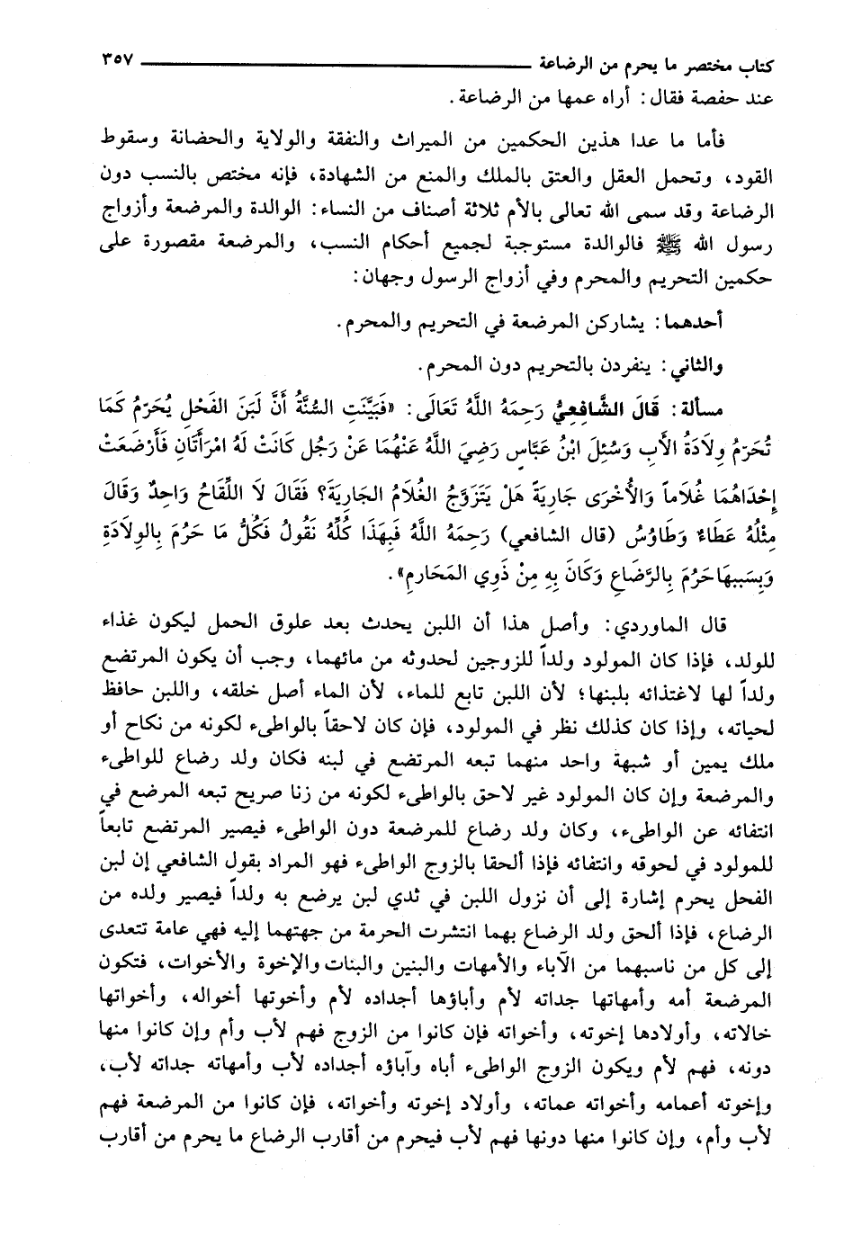 قال الشافعي رحمه الله تعالى: " فَبَيَّنَتِ السُّنَّةُ أَنَّ لَبَنَ الْفَحْلِ يُحَرِّمُ كَمَا تُحَرِّمُ وِلَادَةُ الْأَبِ وَسُئِلَ ابْنُ عَبَّاسٍ رَضِيَ اللَّهُ عَنْهُمَا عَنْ رَجُلٍ كَانَتْ لَهُ امْرَأَتَانِ فَأَرْضَعَتْ إِحْدَاهُمَا غُلَامًا وَالْأُخْرَى جَارِيَةً هَلْ يَتَزَوَّجُ الْغُلَامُ الْجَارِيَةَ؟ فَقَالَ لَا اللِّقَاحُ وَاحِدٌ وَقَالَ مِثْلَهُ عَطَاءٌ وَطَاوُسٌ (قَالَ الشَّافِعِيُّ) رَحِمَهُ اللَّهُ فَبِهَذَا كُلِّهِ نَقُولُ فَكُلُّ مَا حَرُمَ بِالْوِلَادَةِ وَبِسَبَبِهَا حَرُمَ بِالرَّضَاعِ وَكَانَ بِهِ مِنْ ذَوِي الْمَحَارِمِ ".