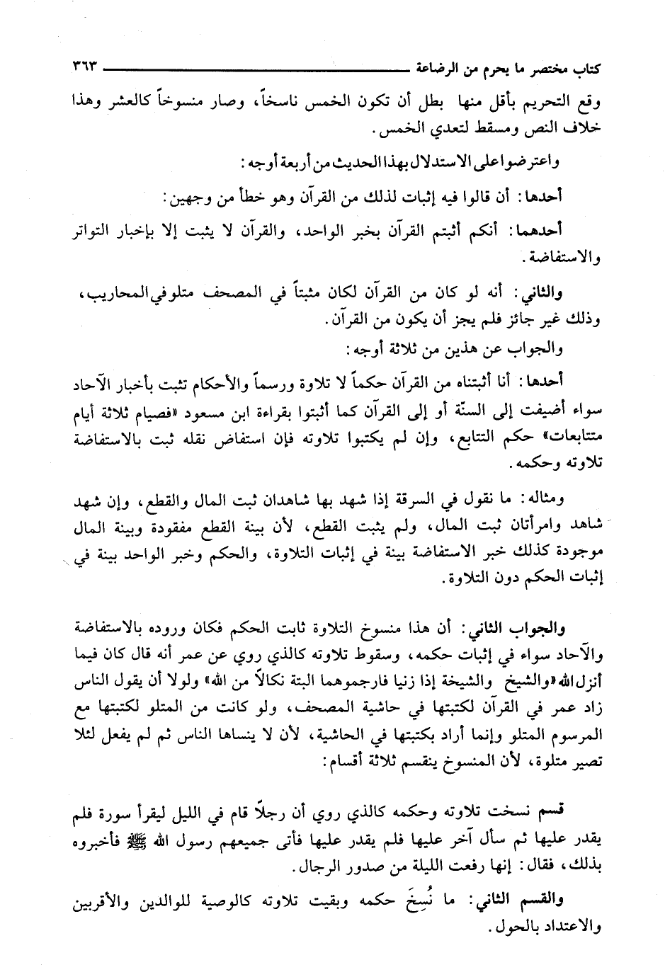وَالْجَوَابُ الثَّانِي: أَنَّ هَذَا مَنْسُوخُ التِّلَاوَةِ ثَابِتُ الْحُكْمِ فَكَانَ وُرُودُهُ بِالِاسْتِفَاضَةِ وَالْآحَادِ سَوَاءً فِي إِثْبَاتِ حُكْمِهِ، وَسُقُوطِ تِلَاوَتِهِ كَالَّذِي رُوِيَ عَنْ عُمَرَ أَنَّهُ قَالَ كَانَ فِيمَا أَنْزَلَ اللَّهُ " وَالشَّيْخُ وَالشَّيْخَةُ إِذَا زَنَيَا فَارْجُمُوهُمَا الْبَتَّةَ نَكَالًا مِنَ اللَّهِ " وَلَوْلَا أَنْ يَقُولَ النَّاسُ زَادَ عَمَرُ فِي الْقُرْآنِ لَكَتَبْتُهَا فِي حَاشِيَةِ الْمُصْحَفِ، وَلَوْ كَانَتْ مِنَ الْمَتْلُوِّ لَكَتَبْتُهَا مَعَ الْمَرْسُومِ الْمَتْلُوِّ وَإِنَّمَا أراد بكتبتها في الحاشية، لأن لا يَنْسَاهَا النَّاسُ ثُمَّ لَمْ يَفْعَلْ لِئَلَّا تَصِيرَ مَتْلُوَّةً، لِأَنَّ الْمَنْسُوخَ يَنْقَسِمُ ثَلَاثَةَ أَقْسَامٍ: