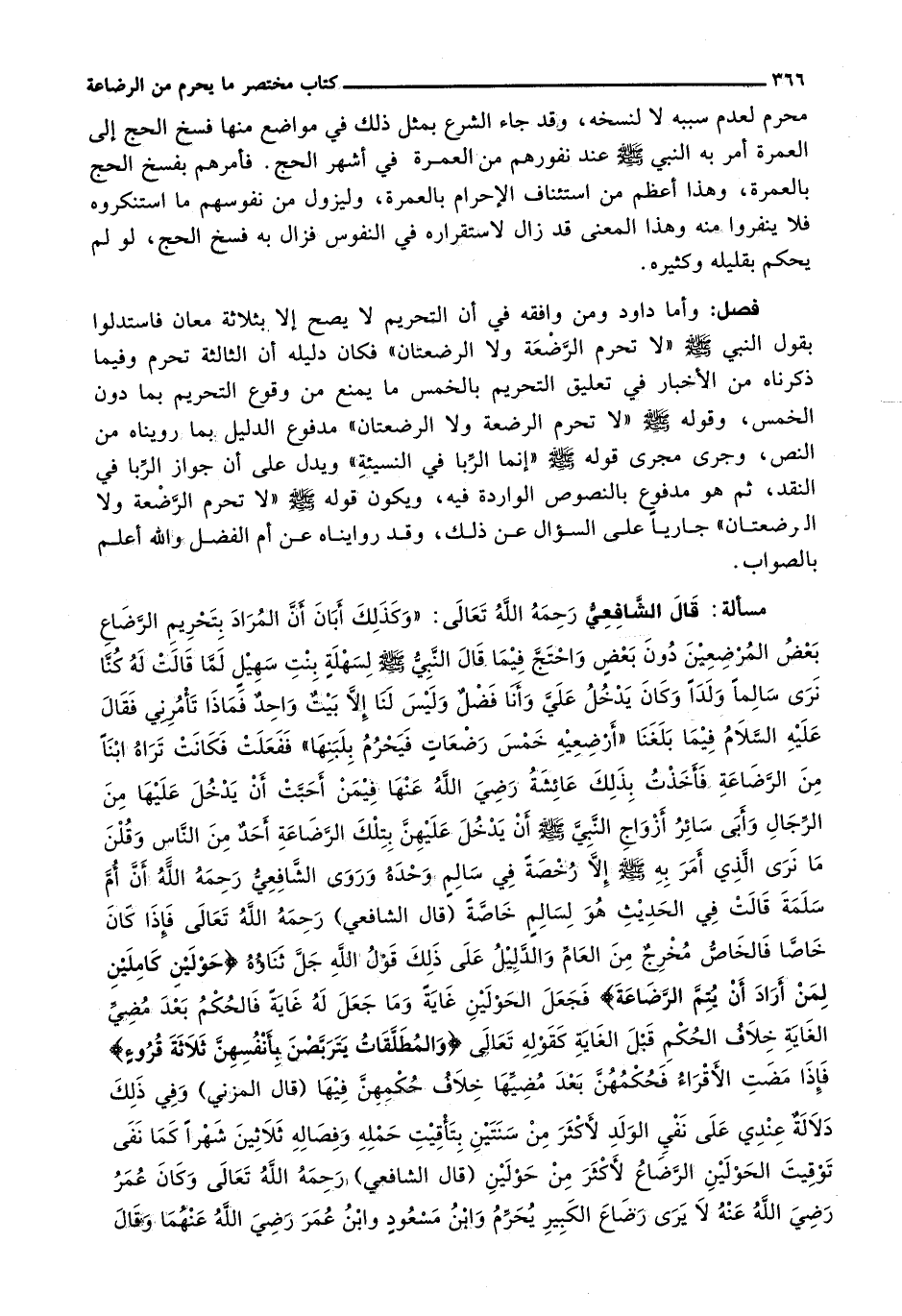 قال الشافعي رحمه الله تعالى: " وَكَذَلِكَ أَبَانَ أَنَّ الْمُرَادَ بِتَحْرِيمِ الرَّضَاعِ بَعْضُ الْمُرْضِعِينَ دُونَ بَعْضٍ وَاحْتَجَّ فِيمَا قَالَ النَّبِيُّ - صَلَّى اللَّهُ عَلَيْهِ وَسَلَّم َ - لِسَهْلَةَ بِنْتِ سُهَيْلٍ لَمَّا قَالَتْ لَهُ كُنَّا نَرَى سَالِمًا وَلَدًا وَكَانَ يَدْخُلُ عَلَيَّ وَأَنَا فَضْلٌ وَلَيْسَ لَنَا إِلَّا بَيْتٌ وَاحِدٌ فَمَاذَا تَأْمُرِنِي فَقَالَ عَلَيْهِ السَّلَامُ فِيمَا بَلَغَنَا " أَرْضِعِيهِ خَمْسَ رَضَعَاتٍ فَيَحْرُمُ بِلَبَنِهَا " فَفَعَلَتْ فَكَانَتْ تَرَاهُ ابنا من الرضاعة فأخذت بذلك عائشة رضي الله عنها فيمن أحبت أن يدخل عليها من الرجال وأبى سائر أزواج النبي - صَلَّى اللَّهُ عَلَيْهِ وَسَلَّم َ - أن يدخل عليهن بتلك الرضاعة أحد من الناس وقلن ما نرى الذي أمر به - صَلَّى اللَّهُ عَلَيْهِ وَسَلَّم َ - إلا رخصة في سالم وحده وروى الشافعي رحمه الله أن أم سلمة قالت في الحديث هو لسالم خاصة (قال الشافعي) رحمه الله تعالى فإذا كان خاصا فالخاص مخرج من العام والدليل على ذلك قول الله جل ثناؤه {حَوْلَيْنِ كَامِلَيْنِ لِمَنْ أَرَادَ أَنْ يُتِمَّ الرَّضَاعَةَ} فجعل الحولين غاية وما جعل له غاية فالحكم بعد مضي الغاية خلاف الحكم قبل الغاية كَقَوْلِهِ تَعَالَى {وَالْمُطَلَّقَاتُ يَتَرَبَّصْنَ بِأَنْفُسِهِنَّ ثَلاثَةَ قُرُوءٍ} فإذا مضت الأقراء فحكمهن بعد مضيها خلاف حكمهن فيها (قَالَ الْمُزَنِيُّ) وَفِي ذَلِكَ دَلَالَةٌ عِنْدِي عَلَى نَفْيِ الْوَلَدِ لِأَكْثَرَ مِنْ سَنَتَيْنِ بِتَأْقِيتِ حَمْلِهِ وفصاله ثلاثين شهراً كما نفى توقيت حولين الرضاع لأكثر من الحولين (قال الشافعي) رحمه الله تعالى وكان عمر رضي الله عنه لا يرى رضاع الكبير يحرم وابن مسعود وابن عمر رضي الله عنهما وقال