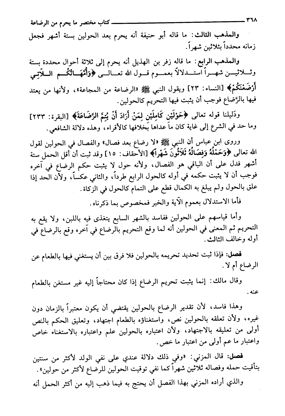 وَرَوَى ابْنُ عَبَّاسٍ أَنَّ النَّبِيَّ - صَلَّى اللَّهُ عَلَيْهِ وَسَلَّم َ - " لَا رَضَاعَ بَعْدَ فِصَالٍ " وَالْفِصَالُ فِي الْحَوْلَيْنِ لِقَوْلِ اللَّهِ تَعَالَى {وَحَمْلُهُ وَفِصَالُهُ ثَلاثُونَ شَهْرًا} [الأحقاف: 15] وَقَدْ ثَبَتَ أَنَّ أَقَلَّ الْحَمْلِ سِتَّةُ أَشْهُرٍ فَدَلَّ عَلَى أَنَّ الْبَاقِيَ هُوَ الْفِصَالُ، وَلِأَنَّهُ حَوْلٌ لَا يَثْبُتُ حُكْمُ الرَّضَاعِ فِي آخِرِهِ فَوَجَبَ أَنْ لَا يَثْبُتَ حُكْمُهُ فِي أَوَّلِهِ كَالْحَوْلِ الرَّابِعِ طَرْدًا، وَالثَّانِي عَكْسًا، وَلِأَنَّ الْحَدَّ إِذَا عُلِّقَ بِالْحَوْلِ وَلَمْ يَبْلُغْ بِهِ الْكَمَالَ قُطِعَ عَلَى التَّمَامِ كَالْحَوْلِ فِي الزَّكَاةِ.