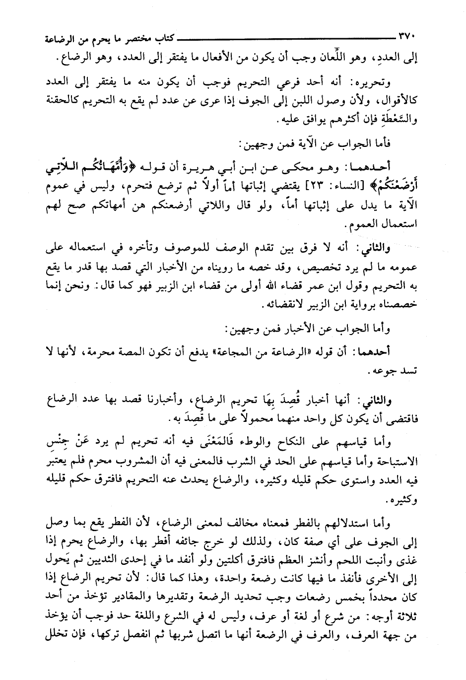 والثاني: أنه لا فرق بين تقدم الوصف للموصوف وتأخره في استعماله على عمومه ما لم يرد تخصيص، وقد خصه ما رويناه من الأخبار التي قصد بها قدر ما يقع به التحريم وقول ابن عمر قضاء الله أولى من قضاء ابن الزبير فهو كمال قال: ونحن إنما خصصناه برواية ابن الزبير لانقضائه.