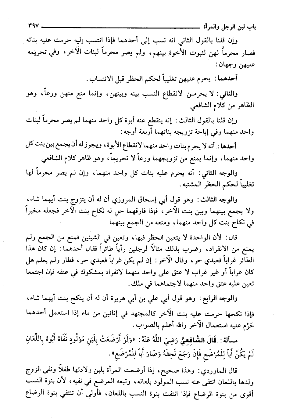 قَالَ الْمَاوَرْدِيُّ: وَهَذَا صَحِيحٌ، إِذَا أَرْضَعَتِ الْمَرْأَةُ بِلَبَنِ وِلَادَتِهَا طِفْلًا وَنَفَى الزَّوْجُ وَلَدَهَا بِاللِّعَانِ انْتَفَى عَنْهُ نَسَبُ الْمَوْلُودِ بِلِعَانِهِ، وَتَبِعَهُ الْمُرْضَعُ فِي نَفْيِهِ، لِأَنَّ بُنُوَّةَ النَّسَبِ أَقْوَى مِنْ بُنُوَّةِ الرَّضَاعِ فَإِذَا انْتَفَتْ بُنُوَّةُ النَّسَبِ بِاللِّعَانِ، فَأَوْلَى أَنْ تَنْتَفِيَ بُنُوَّةُ الرضاع