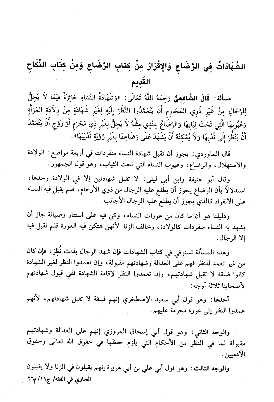 قال الشافعي رحمه الله تعالى: " وَشَهَادَةُ النِّسَاءِ جَائِزَةٌ فِيمَا لَا يَحِلُّ لِلرِّجَالِ مِنْ غَيْرِ ذَوِي الْمَحَارِمِ أَنْ يَتَعَمَّدُوا النَّظَرَ إِلَيْهِ لِغَيْرِ شَهَادَةٍ مِنْ وِلَادَةِ الْمَرْأَةِ وَعُيُوبِهَا الَّتِي تَحْتَ ثِيَابِهَا وَالرَّضَاعُ عِنْدِي مِثْلُهُ لَا يَحِلُّ لِغَيْرِ ذِي مَحْرَمٍ أَوْ زَوْجٍ أَنْ يَتَعَمَّدَ أَنْ يَنْظُرَ إِلَى ثَدْيِهَا وَلَا يُمْكِنُهُ أَنْ يَشْهَدَ عَلَى رَضَاعِهَا بِغَيْرِ رُؤْيَةِ ثَدْيَيْهَا ".