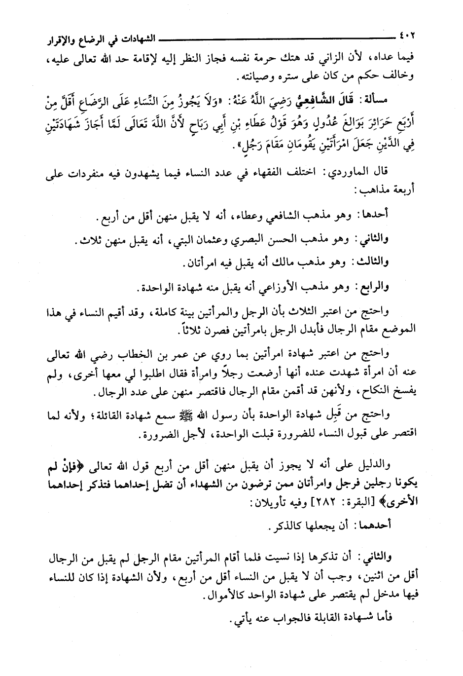 قَالَ الْمَاوَرْدِيُّ: اخْتَلَفَ الْفُقَهَاءُ فِي عَدَدِ النِّسَاءِ فِيمَا يَشْهَدُونَ فِيهِ مُنْفَرِدَاتٍ عَلَى أَرْبَعَةِ مَذَاهِبَ:
