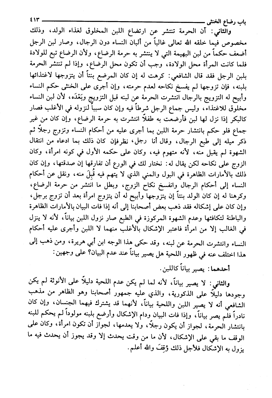 وَالثَّانِي: أَنَّ الْحُرْمَةَ تَنْتَشِرُ عَنِ ارْتِضَاعِ اللَّبَنِ الْمَخْلُوقِ لِغِذَاءِ الْوَلَدِ، وَذَلِكَ مَخْصُوصٌ فِيمَا خَلَقَهُ اللَّهُ تَعَالَى غَالِبًا مِنْ أَلْبَانِ النِّسَاءِ دُونَ الرِّجَالِ، وَصَارَ لَبَنُ الرَّجُلِ أَضْعَفَ حُكْمًا مِنْ لَبَنِ الْبَهِيمَةِ الَّتِي لَا يَنْتَشِرُ بِهِ حُرْمَةُ الرَّضَاعِ، وَلِأَنَّ الرَّضَاعَ تَبَعٌ لِلْوِلَادَةِ فَلَمَّا كَانَتِ الْمَرْأَةُ مَحَلَّ الْوِلَادَةِ، وَجَبَ أَنْ تَكُونَ مَحَلَّ الرَّضَاعِ، وَإِذَا لَمْ تَنْتَشِرِ الْحُرْمَةُ بِلَبَنِ الرَّجُلِ فَقَدْ قَالَ الشَّافِعِيُّ: كَرِهْتُ لَهُ إِنْ كَانَ الْمُرْضَعُ بِنْتًا أَنْ يَتَزَوَّجَهَا لِاغْتِذَائِهَا بِلَبَنِهِ، فَإِنْ تَزَوَّجَهَا لَمْ يُفْسَخْ نِكَاحُهُ لِعَدَمِ حُرْمَتِهِ، وَإِنْ أُجْرِيَ عَلَى الْخُنْثَى حُكْمُ النِّسَاءِ وَأُبِيحِ لَهُ التَّزْوِيجُ بِالرِّجَالِ انْتَشَرَتِ الْحُرْمَةُ عَنْ لَبَنِهِ قَبْلَ التَّزْوِيجِ وَبَعْدَهُ، لِأَنَّ لَبَنَ النِّسَاءِ مَخْلُوقٌ لِلِاغْتِذَاءِ، وَلَيْسَ جِمَاعُ الرَّجُلِ شَرْطًا فِيهِ وَإِنْ كَانَ سَبَبًا لِنُزُولِهِ فِي الْأَغْلَبِ فَصَارَ كَالْبِكْرِ إِذَا نَزَلَ لَهَا لَبَنٌ فَأَرْضَعَتْ بِهِ طِفْلًا انْتَشَرَتْ بِهِ حُرْمَةُ الرَّضَاعِ، وَإِنْ كَانَ مِنْ غَيْرِ جِمَاعٍ فَلَوْ حُكِمَ بِانْتِشَارِ حُرْمَةِ اللَّبَنِ بِمَا أُجْرِيَ عَلَيْهِ مِنْ أَحْكَامِ النِّسَاءِ وَتَزَوَّجَ رَجُلًا ثُمَّ ذَكَرَ مَيْلَهُ إِلَى طَبْعِ الرِّجَالِ، وَقَالَ أَنَا رَجُلٌ، نُظِرَ فَإِنْ كَانَ ذَلِكَ بِمَا ادَّعَاهُ مِنَ انْتِقَالِ الشَّهْوَةِ لَمْ يُقْبَلْ مِنْهُ، لِأَنَّهُ مُتَهَوِّمٌ فِيهِ، وَكَانَ عَلَى حُكْمِهِ الْأَوَّلِ فِي كَوْنِهِ امْرَأَةً، وَكَانَ الزَّوْجُ عَلَى نِكَاحِهِ لَكِنْ يُقَالُ لَهُ: نَخْتَارُ لَكَ فِي الْوَرَعِ أَنْ تُفَارِقَهَا إِنْ صَدَّقْتَهَا، وَإِنْ كَانَ ذَلِكَ بِالْأَمَارَاتِ الظَّاهِرَةِ فِي الْبَوْلِ وَالْمَنِيِّ الَّذِي لَا يُتَّهَمُ فِيهِ قُبِلَ مِنْهُ، وَنُقِلَ عَنْ أَحْكَامِ النِّسَاءِ إِلَى أَحْكَامِ الرِّجَالِ وَانْفَسَخَ نِكَاحُ الزَّوْجِ، وَبَطَلَ مَا انْتَشَرَ مِنْ حُرْمَةِ الرَّضَاعِ، وَكَرِهْنَا لَهُ إِنْ كَانَ الْوَلَدُ بِنْتًا أَنْ يَتَزَوَّجَهَا وَأُبِيحَ لَهُ أَنْ يَتَزَوَّجَ امْرَأَةً بَعْدَ أَنْ تَزَوَّجَ بِرَجُلٍ، وَإِنْ كَانَ عَلَى إِشْكَالِهِ فَقَدْ ذَهَبَ بَعْضُ أَصْحَابِنَا إِلَى أَنَّهُ إِذَا فَاتَ الْبَيَانُ بِالْأَمَارَاتِ الظَّاهِرَةِ وَالْبَاطِنَةِ لِتَكَافُئِهَا وَعَدَمِ الشَّهْوَةِ الْمَرْكُوزَةِ فِي الطَّبْعِ صَارَ نُزُولُ اللَّبَنِ بَيَانًا، لِأَنَّهُ لَا يَنْزِلُ فِي الْغَالِبِ إِلَّا مِنَ امْرَأَةٍ فَاعْتُبِرَ الْإِشْكَالُ بِالْأَغْلَبِ مِنْهُمَا لَا اللَّبَنُ وَأُجْرِيَ عَلَيْهِ أَحْكَامُ النِّسَاءِ وَانْتَشَرَتِ الْحُرْمَةُ عَنْ لَبَنِهِ، وَقَدْ حَكَى هَذَا الْوَجْهَ ابْنُ أَبِي هُرَيْرَةَ، وَمَنْ ذَهَبَ إِلَى هَذَا اخْتَلَفَ عَنْهُ فِي ظُهُورِ اللِّحْيَةِ هَلْ يَصِيرُ بَيَانًا عِنْدَ عَدَمِ الْبَيَانِ؟ عَلَى وَجْهَيْنِ: