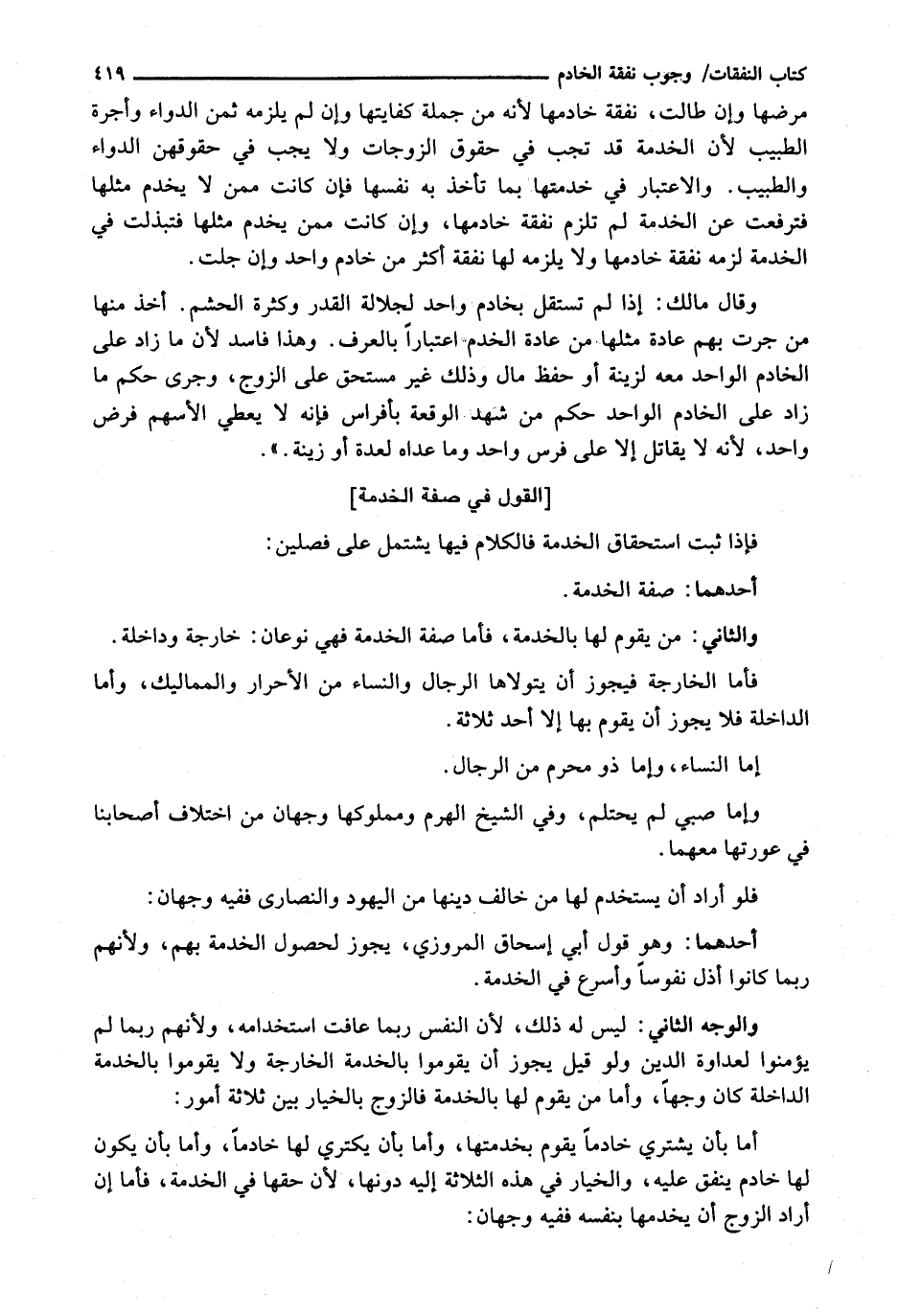 وَقَالَ مَالِكٌ: إِذَا لَمْ تَسْتَقِلَّ بِخَادِمٍ وَاحِدٍ لِجَلَالَةِ الْقَدْرِ وَكَثْرَةِ الْحَشَمِ. أُخِذَ مِنْهَا مَنْ جَرَتْ بِهِمْ عَادَةُ مِثْلِهَا مِنْ عَادَةِ الْخَدَمِ اعْتِبَارًا بِالْعُرْفِ. وَهَذَا فَاسِدٌ لِأَنَّ مَا زَادَ عَلَى الْخَادِمِ الْوَاحِدِ مَعَهُ لِزِينَةٍ أَوْ حِفْظِ مَالٍ وَذَلِكَ غَيْرُ مُسْتَحَقٍّ عَلَى الزَّوْجِ، وَجَرَى حُكْمُ مَا زَادَ عَلَى الْخَادِمِ الْوَاحِدِ حُكْمَ مَنْ شَهِدَ الْوَقْعَةَ بِأَفْرَاسٍ فَإِنَّهُ لَا يُعْطَى الأسهم فَرْضٍ وَاحِدٍ، لِأَنَّهُ لَا يُقَاتِلُ إِلَّا عَلَى فَرَسٍ وَاحِدٍ وَمَا عَدَاهُ لِعِدَّةٍ أَوْ زِينَةٍ. ".