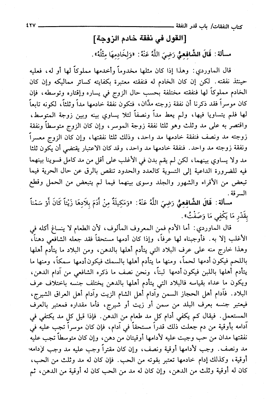 قَالَ الْمَاوَرْدِيُّ: وَهَذَا إِذَا كَانَ مِثْلُهَا مَخْدُومًا وَأَخْدَمَهَا مَمْلُوكًا لَهَا أَوْ لَهُ، فَعَلَيْهِ حِينَئِذٍ نَفَقَتُهُ. لَكِنْ إِنْ كَانَ الْخَادِمُ لَهُ فَنَفَقَتُهُ مُعْتَبَرَةٌ بِكِفَايَتِهِ كَسَائِرِ مَمَالِيكِهِ وَإِنْ كَانَ الْخَادِمُ مَمْلُوكًا لَهَا فَنَفَقَتُهُ مُخْتَلِفَةٌ بِحَسْبِ حَالِ الزَّوْجِ فِي يَسَارِهِ وَإِقْتَارِهِ وَتَوَسُّطِهِ، فَإِنْ كَانَ مُوسِرًا فَقَدْ ذَكَرْنَا أَنَّ نَفَقَةَ زَوْجَتِهِ مُدَّانِ، فَتَكُونُ نَفَقَةُ خَادِمِهَا مُدًّا وَثُلُثًا، لِكَوْنِهِ تَابِعًا لَهَا فَلَمْ يَتَسَاوَيَا فِيهَا، وَلَمْ يُعْطَ مُدًّا وَنِصْفًا لِئَلَّا يُسَاوَى بَيْنَهُ وَبَيْنَ زَوْجَةِ الْمُتَوَسِّطِ، وَاقْتُصِرَ بِهِ عَلَى مُدٍّ وَثُلُثٍ وَهُوَ ثُلُثَا نَفَقَةِ زَوْجَةِ الْمُوسِرِ، وَإِنْ كَانَ الزَّوْجُ مُتَوَسِّطًا وَنَفَقَةُ زَوْجَتِهِ مُدٌّ وَنِصْفٌ فَنَفَقَةُ خَادِمِهَا مُدٌّ وَاحِدٌ، وَذَلِكَ ثُلُثَا نَفَقَتِهَا، وَإِنْ كَانَ الزَّوْجُ مُعْسِرًا وَنَفَقَةُ زَوْجَتِهِ مُدٌّ وَاحِدٌ. فَنَفَقَةُ خَادِمِهَا مُدٌّ وَاحِدٌ، وَقَدْ كَانَ الِاعْتِبَارُ يَقْتَضِي أَنْ يَكُونَ ثُلُثَا مُدٍّ وَلَا يُسَاوَى بَيْنَهُمَا، لَكِنْ لَمْ يَقُمْ بَدَنٌ فِي الْأَغْلَبِ عَلَى أَقَلَّ مِنْ مُدٍّ كَامِلٍ فَسَوَّيْنَا بَيْنَهُمَا فِيهِ لِلضَّرُورَةِ الدَّاعِيَةِ إِلَى التَّسْوِيَةِ كَالْعَدَدِ وَالْحُدُودِ تَنْقُصُ بِالرِّقِّ عَنْ حَالِ الْحُرِّيَّةِ فِيمَا تَبَعَّضَ مِنَ الْأَقْرَاءِ وَالشُّهُورِ وَالْجَلْدِ وَسُوِّيَ بَيْنُهَمَا فِيمَا لَمْ يَتَبَعَّضْ مِنَ الْحَمْلِ وَقَطْعِ السَّرِقَةِ.