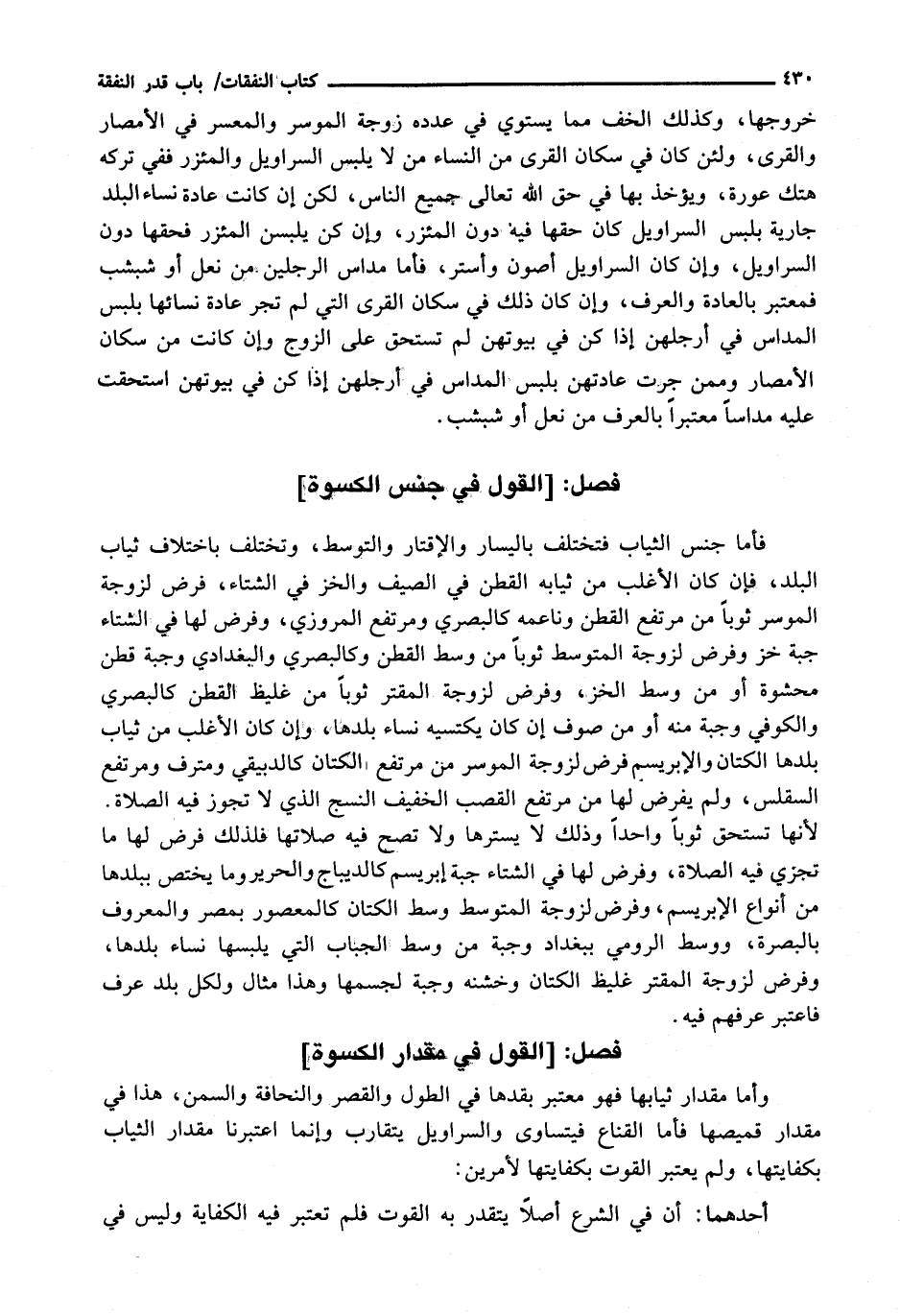 خُرُوجِهَا، وَكَذَلِكَ الْخُفُّ مِمَّا يَسْتَوِي فِي عَدَدِهِ زَوْجَةُ الْمُوسِرِ وَالْمُعْسِرِ فِي الْأَمْصَارِ وَالْقُرَى، وَلَئِنْ كَانَ فِي سُكَّانِ الْقُرَى مِنَ النِّسَاءِ مَنْ لَا يَلْبَسُ السَّرَاوِيلَ وَالْمِئْزَرَ فَفِي تَرْكِهِ هَتْكُ عَوْرَةٍ، وَيُؤْخَذُ بِهَا فِي حَقَّ اللَّهِ تَعَالَى جَمِيعُ النَّاسِ، لَكِنْ إِنْ كَانَتْ عَادَةُ نِسَاءِ الْبَلَدِ جَارِيَةً بِلَبْسِ السَّرَاوِيلِ كَانَ حَقُّهَا فِيهِ دُونَ الْمِئْزَرِ، وَإِنْ كُنَّ يَلْبَسْنَ الْمِئْزَرَ فَحَقُّهَا دون السراويل، وإن كان السَّرَاوِيلُ أَصْوَنَ وَأَسْتَرَ، فَأَمَّا مَدَاسُ الرِّجْلَيْنِ مِنْ نعل أو شبشب فمعتبر بالعادة والعرف، وإن كَانَ ذَلِكَ فِي سُكَّانِ الْقُرَى الَّتِي لَمْ تَجْرِ عَادَةُ نِسَائِهَا بِلُبْسِ الْمَدَاسِ فِي أَرْجُلِهِنَّ إِذَا كُنَّ فِي بُيُوتِهِنَّ لَمْ تَسْتَحِقَّ عَلَى الزَّوْجِ وَإِنْ كَانَتْ مِنْ سُكَّانِ الْأَمْصَارِ وَمِمَّنْ جَرَتْ عَادَتُهُنَّ بِلُبْسِ الْمَدَاسِ فِي أَرْجُلِهِنَّ إِذَا كُنَّ فِي بُيُوتِهِنَّ اسْتَحَقَّتْ عَلَيْهِ مَدَاسًا مُعْتَبَرًا بالعرف من نعل أو شبشب.