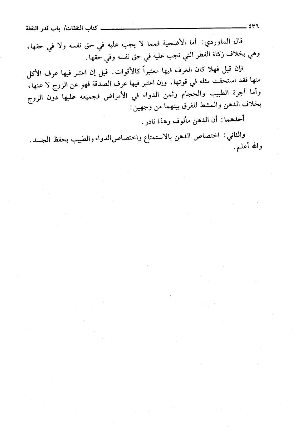 فَإِنْ قِيلَ فَهَلَّا كَانَ الْعُرْفُ فِيهَا مُعْتَبَرًا كَالْأَقْوَاتِ. قِيلَ إِنِ اعْتُبِرَ فِيهَا عُرْفُ الْأَكْلِ مِنْهَا فَقَدِ اسْتَحَقَّتْ مِثْلَهُ فِي قُوتِهَا، وَإِنِ اعْتُبِرَ فِيهَا عُرْفُ الصَّدَقَةِ فَهُوَ عَنِ الزَّوْجِ لَا عَنْهَا، وَأَمَّا أُجْرَةُ الطَّبِيبِ وَالْحَجَّامِ وَثَمَنُ الدَّوَاءِ فِي الْأَمْرَاضِ فَجَمِيعُهُ عَلَيْهَا دُونَ الزَّوْجِ بِخِلَافِ الدُّهْنِ وَالْمُشْطِ لِلْفَرْقِ بَيْنَهُمَا مِنْ وَجْهَيْنِ: