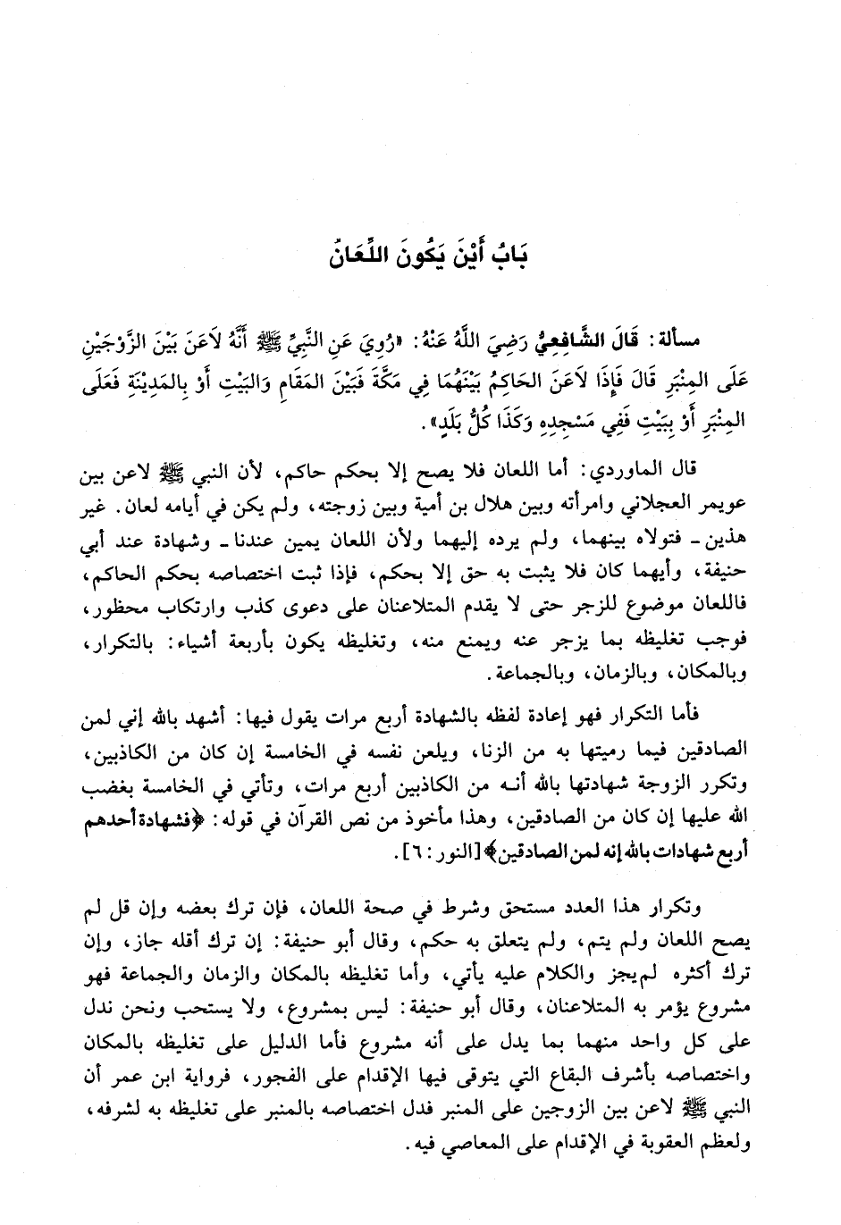 قال الشافعي رضي الله عنه: " رُوِيَ عَنِ النَّبِيِّ - صَلَّى اللَّهُ عَلَيْهِ وَسَلَّم َ - أَنَّهُ لَاعَنَ بَيْنَ الزَّوْجَيْنِ عَلَى الْمِنْبَرِ قَالَ فَإِذَا لَاعَنَ الْحَاكِمُ بَيْنَهُمَا فِي مَكَّةَ فَبَيْنَ الْمَقَامِ وَالْبَيْتِ أَوْ بِالْمَدِينَةِ فَعَلَى الْمِنْبَرِ أَوْ ببيت ففي مسجده وَكَذَا كُلُّ بَلَدٍ ".