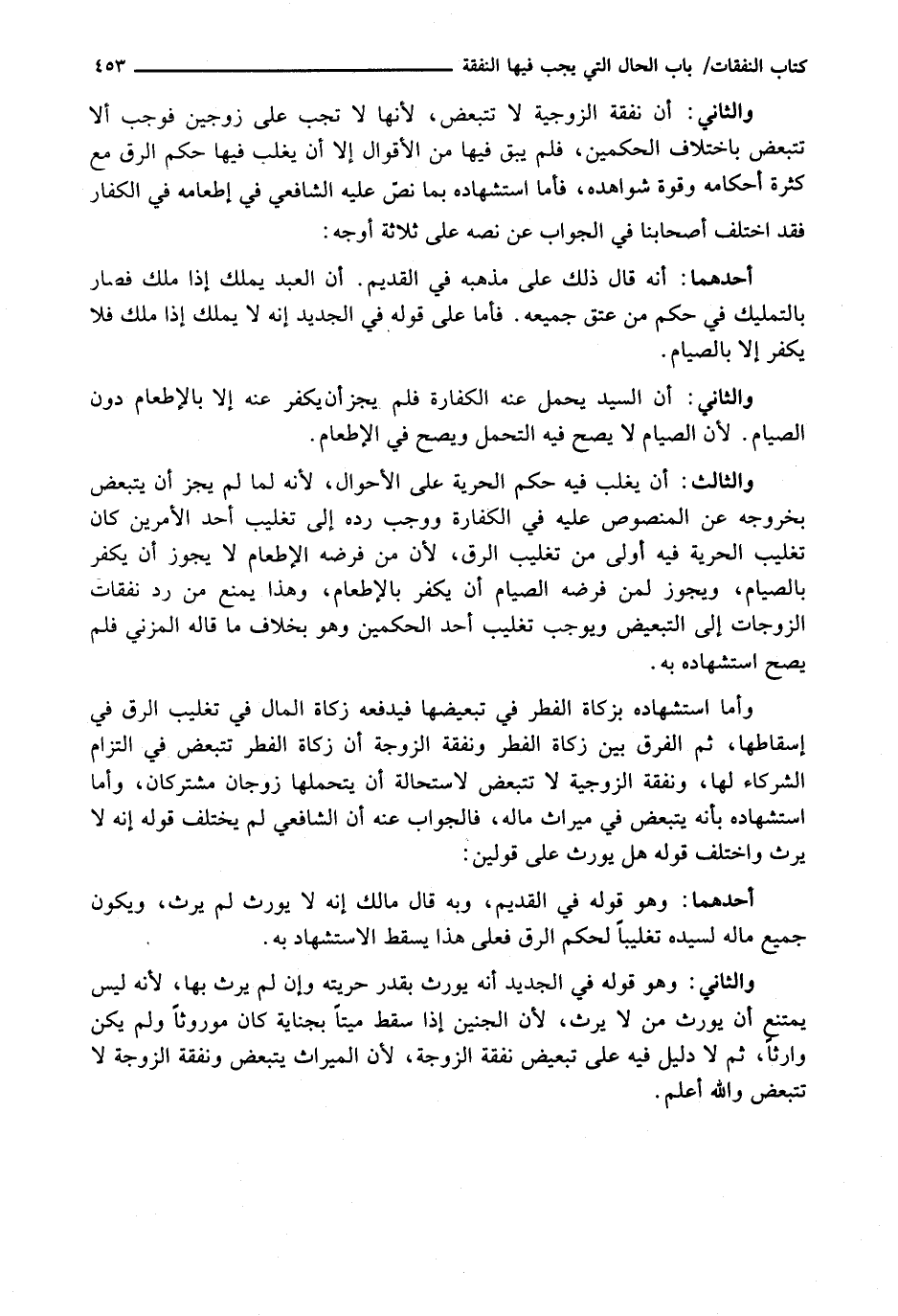 وَأَمَّا اسْتِشْهَادُهُ بِزَكَاةِ الْفِطْرِ فِي تَبْعِيضِهَا فَيَدْفَعُهُ زَكَاةُ الْمَالِ فِي تَغْلِيبِ الرِّقِّ فِي إِسْقَاطِهَا، ثُمَّ الْفَرْقُ بَيْنَ زَكَاةِ الْفِطْرِ وَنَفَقَةِ الزَّوْجَةِ أَنَّ زَكَاةَ الْفِطْرِ تَتَبَعَّضُ فِي الْتِزَامِ الشُّرَكَاءِ لَهَا، وَنَفَقَةَ الزَّوْجِيَّةِ لَا تَتَبَعَّضُ لِاسْتِحَالَةِ أَنْ يَتَحَمَّلَهَا زَوْجَانِ مُشْتَرِكَانِ، وَأَمَّا اسْتِشْهَادُهُ بِأَنَّهُ يَتَبَعَّضُ فِي مِيرَاثِ مَالِهُ، فَالْجَوَابُ عَنْهُ أَنَّ الشَّافِعِيَّ لَمْ يَخْتَلِفْ قَوْلُهُ إِنَّهُ لَا يَرِثُ وَاخْتَلَفَ قَوْلُهُ هَلْ يُورَثُ عَلَى قَوْلَيْنِ: