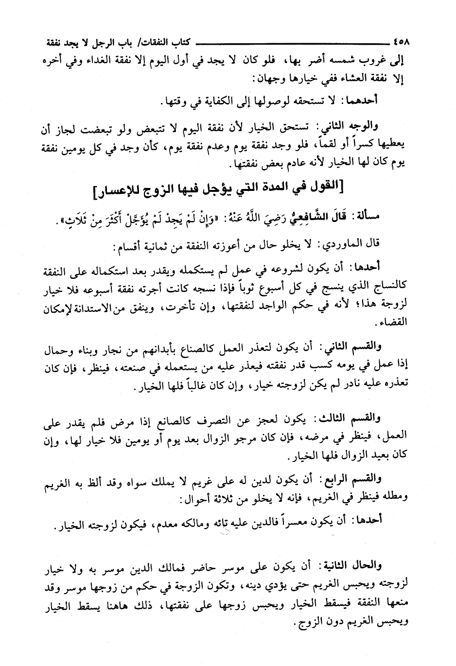 أَحَدُهَا: أَنْ يَكُونَ لِشُرُوعِهِ فِي عَمَلٍ لَمْ يَسْتَكْمِلْهُ وَيَقْدِرُ بَعْدَ اسْتِكْمَالِهِ عَلَى النَّفَقَةِ كَالنَّسَّاجَ الَّذِي يَنْسِجُ فِي كُلِّ أُسْبُوعٍ ثَوْبًا فَإِذَا نَسَجَهُ كَانَتْ أُجْرَتُهُ نَفَقَةَ أُسْبُوعِهِ فَلَا خِيَارَ لِزَوْجَةِ هَذَا؛ لِأَنَّهُ فِي حُكْمِ الْوَاجِدِ لِنَفَقَتِهَا، وَإِنْ تَأَخَّرَتْ، وَيُنْفِقُ مِنَ الِاسْتِدَانَةِ لِإِمْكَانِ الْقَضَاءِ.