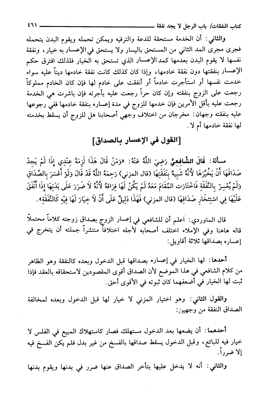 قَالَ الشافعي رضي الله عنه: " ومن قال هذا لَزِمَهُ عِنْدِي إِذَا لَمْ يَجِدْ صَدَاقَهَا أَنْ يخيرها لأنه شبيه بنفقتها (قال المزني) رحمه الله قد قال ولو أعسر بالصداق ولم يعسر بالنفقة فاختارت المقام معه لم يكن لها فراقة لأنه لا ضرر على بدنها إذا أنفق عليها في استئخار صداقها (قال المزني) فهذا دليل على أن لا خيار لها فيه كالنفقة ".