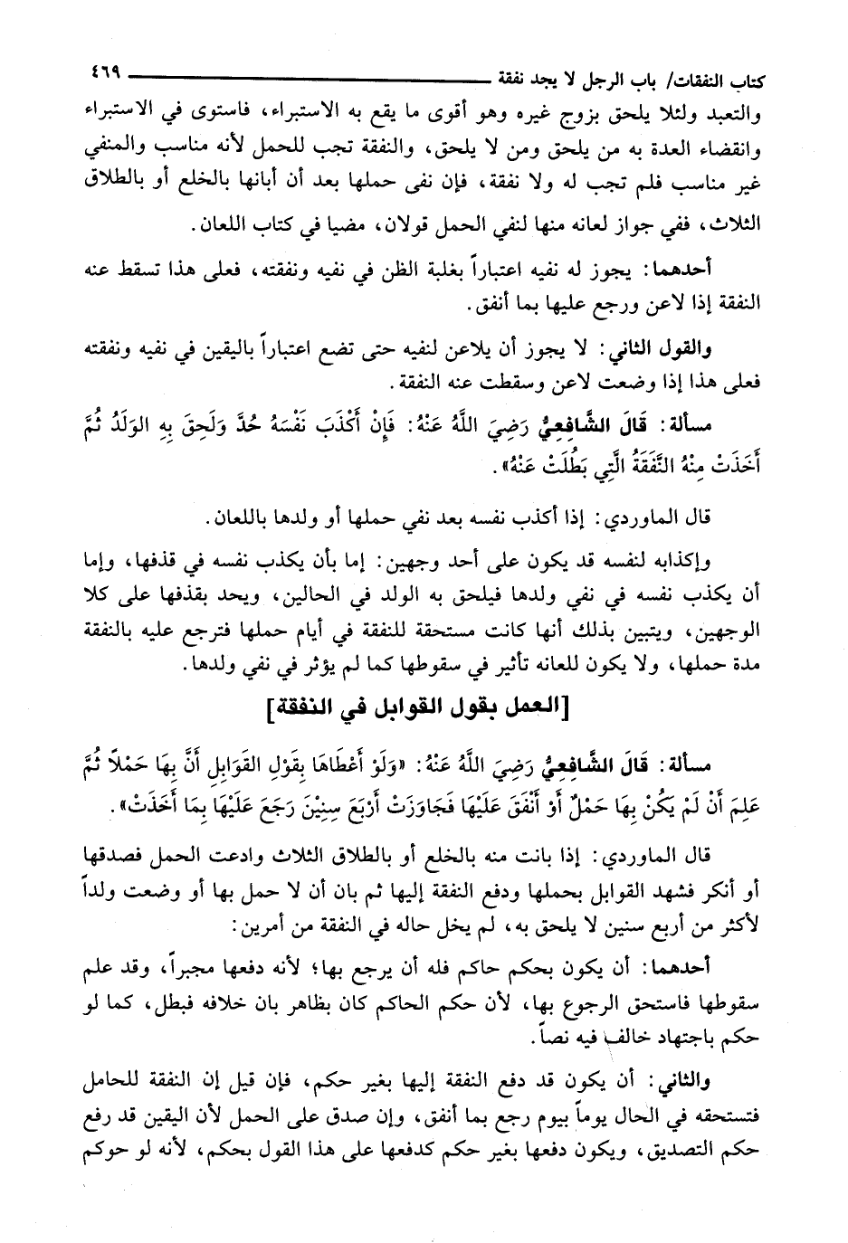 وَالْقَوْلُ الثَّانِي: لَا يَجُوزُ أَنْ يُلَاعِنَ لِنَفْيِهِ حَتَّى تَضَعَ اعْتِبَارًا بِالْيَقِينِ فِي نَفْيِهِ وَنَفَقَتِهِ فَعَلَى هَذَا إِذَا وَضْعَتْ لَاعَنَ وَسَقَطَتْ عَنْهُ النفقة.