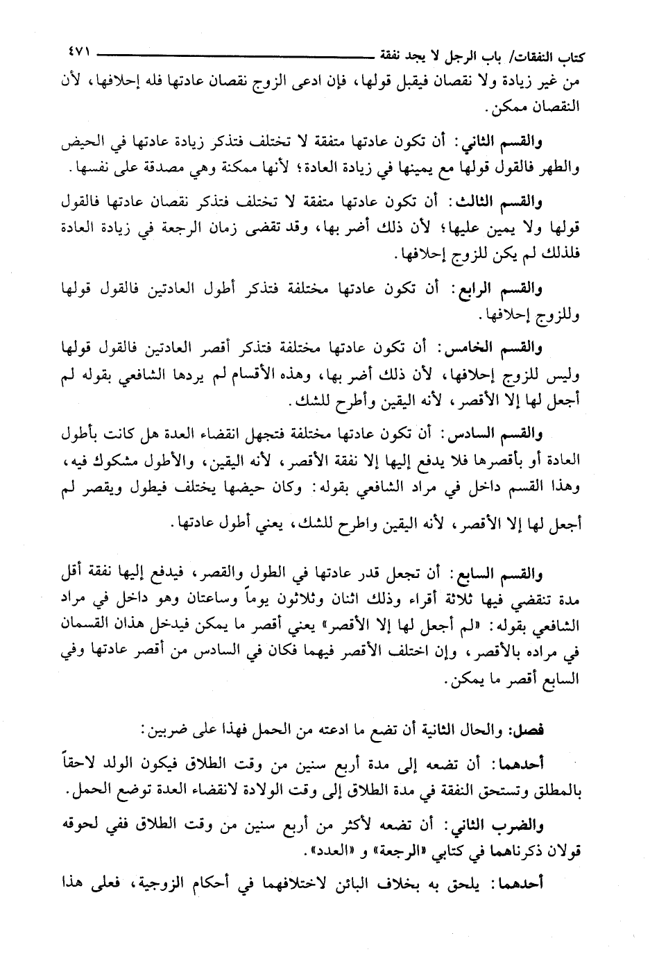 وَالْقِسْمُ السَّادِسُ: أَنْ تَكُونَ عَادَتُهَا مُخْتَلِفَةً فَتَجْهَلَ انْقِضَاءَ الْعِدَّةِ هَلْ كَانَتْ بِأَطْوَلِ الْعَادَةِ أَوْ بِأَقْصَرِهَا فَلَا يَدْفَعُ إِلَيْهَا إِلَّا نَفَقَةَ الْأَقْصَرِ، لِأَنَّهُ الْيَقِينُ، وَالْأَطْوَلُ مَشْكُوكٌ فِيهِ، وَهَذَا الْقِسْمُ دَاخِلٌ فِي مُرَادِ الشَّافِعِيِّ بِقَوْلِهِ: وَكَانَ حَيْضُهَا يَخْتَلِفُ فَيَطُولُ وَيَقْصُرُ لَمْ أَجْعَلْ لَهَا إِلَّا الْأَقْصَرَ، لِأَنَّهُ الْيَقِينُ وَأَطْرَحُ لِلشَّكِّ، يَعْنِي أَطْوَلَ عَادَتِهَا.