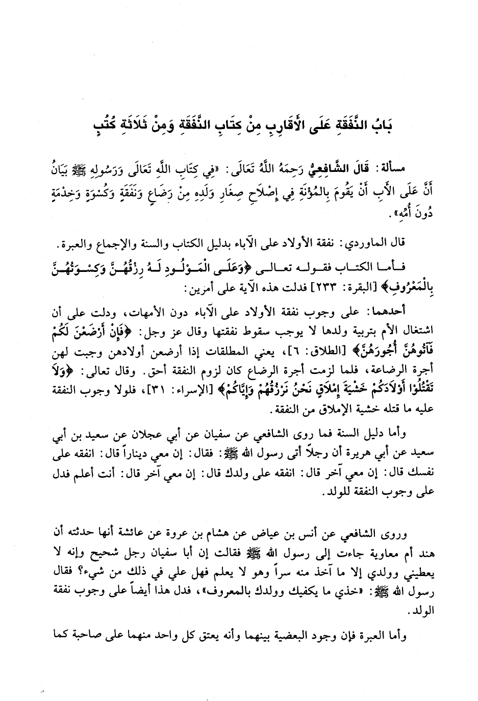 قَالَ الشَّافِعِيُّ رَحِمَهُ اللَّهُ تَعَالَى: " فِي كِتَابِ اللَّهَ تَعَالَى وَرَسُولَهُ - صَلَّى اللَّهُ عَلَيْهِ وَسَلَّم َ - بَيَانٌ أَنَّ عَلَى الْأَبِ أَنْ يَقُومَ بِالْمُؤْنَةِ فِي إِصْلَاحِ صِغَارِ وَلَدِهِ مِنْ رَضَاعٍ وَنَفَقَةٍ وَكِسْوَةٍ وَخِدْمَةٍ دُونَ أُمِّهِ ".
