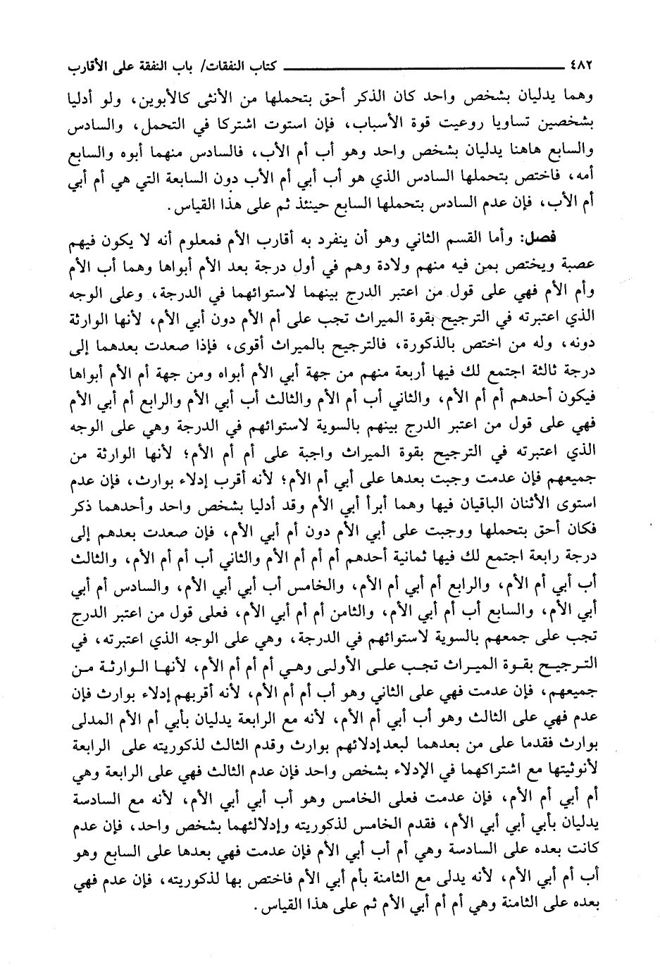 وَأَمَّا الْقِسْمُ الثَّانِي وَهُوَ أَنْ يَنْفَرِدَ بِهِ أَقَارِبُ الْأُمِّ فَمَعْلُومٌ أَنَّهُ لَا يَكُونُ فِيهِمْ عَصَبَةٌ وَيَخْتَصُّ بِمَنْ فِيهِ مِنْهُمْ وِلَادَةً وَهُمْ فِي أَوَّلِ دَرَجَةٍ بَعْدَ الْأُمِّ أَبَوَاهَا وَهُمَا أَبُ الْأُمِّ وَأُمُّ الْأُمِّ فَهِيَ عَلَى قَوْلِ مَنِ اعْتَبَرَ الدَّرَجَ بَيْنَهُمَا لِاسْتِوَائِهِمَا فِي الدَّرَجَةِ، وَعَلَى الْوَجْهِ الَّذِي اعْتَبَرْتُهُ فِي التَّرْجِيحِ بِقُوَّةِ الْمِيرَاثِ تَجِبُ عَلَى أُمِّ الْأُمِّ دُونَ أَبِي الْأُمِّ، لِأَنَّهَا الْوَارِثَةُ دُونَهُ، وَلَهُ مَنِ اخْتُصَّ بِالذُّكُورَةِ، فَالتَّرْجِيحُ بِالْمِيرَاثِ أَقْوَى، فَإِذَا صَعِدْتَ بَعْدَهُمَا إِلَى دَرَجَةٍ ثَالِثَةٍ اجْتَمَعَ لَكَ فِيهَا أَرْبَعَةٌ مِنْهُمْ مِنْ جِهَةِ أَبِي الْأُمِّ أَبَوَاهُ وَمِنْ جِهَةِ أُمِّ الْأُمِّ أَبَوَاهَا فَيَكُونُ أَحَدُهُمْ أُمَّ أُمِّ الْأُمِّ، وَالثَّانِي أَبَ أُمِّ الْأُمِّ وَالثَّالِثُ أَبَ أَبِي الْأُمِّ وَالرَّابِعُ أُمَّ أَبِي الْأُمِّ فَهِيَ عَلَى قَوْلِ مَنِ اعْتَبَرَ الدَّرَجِ بَيْنَهُمْ بِالسَّوِيَّةِ لِاسْتِوَائِهِمْ فِي الدَّرَجَةِ وَهِيَ عَلَى الْوَجْهِ الَّذِي اعْتَبَرْتُهُ فِي التَّرْجِيحِ بِقُوَّةِ الْمِيرَاثِ وَاجِبَةٌ عَلَى أُمِّ أُمِّ الْأُمِّ؛ لِأَنَّهَا الْوَارِثَةُ مِنْ جَمِيعِهِمْ فَإِنْ عُدِمَتْ وَجَبَتْ بَعْدَهَا عَلَى أَبِي أُمِّ الْأُمِّ؛ لِأَنَّهُ أَقْرَبُ إِدْلَاءً بِوَارِثٍ، فَإِنْ عدم استوى الأثنان الباقيان فيها وهما أبرأ أَبِي الْأُمِّ وَقَدْ أَدْلَيَا بِشَخْصٍ وَاحِدٍ وَأَحَدُهُمَا ذَكَرٌ فَكَانَ أَحَقَّ بِتَحَمُّلِهَا وَوَجَبَتْ عَلَى أَبِي الْأُمِّ دُونَ أُمِّ أَبِي الْأُمِّ، فَإِنْ صَعِدْتَ بَعْدَهُمْ إِلَى دَرَجَةٍ رَابِعَةٍ اجْتَمَعَ لَكَ فِيهَا ثَمَانِيَةٌ أَحَدُهُمْ أُمُّ أُمِّ أُمِّ الْأُمِّ وَالثَّانِي أَبُ أُمِّ أُمِّ الْأُمِّ، وَالثَّالِثُ أَبُ أَبِي أُمِّ الْأُمِّ، وَالرَّابِعُ أُمُّ أَبِي أُمِّ الْأُمِّ وَالْخَامِسُ أَبُ أَبِي أَبِي الْأُمِّ، وَالسَّادِسُ أُمُّ أَبِي أَبِي الْأُمِّ، وَالسَّابِعُ أَبُ أُمِّ أَبِي الْأُمِّ، وَالثَّامِنُ أُمُّ أُمِّ أَبِي الْأُمِّ، فَعَلَى قَوْلِ مَنِ اعْتَبَرَ الدَّرَجِ تَجِبُ عَلَى جَمْعِهِمْ بِالسَّوِيَّةِ لِاسْتِوَائِهِمْ فِي الدَّرَجَةِ، وَهِيَ عَلَى الْوَجْهِ الَّذِي اعْتَبَرْتُهُ، فِي التَّرْجِيحِ بِقُوَّةِ الْمِيرَاثِ تَجِبُ عَلَى الْأُولَى وَهِيَ أُمُّ أُمِّ أُمِّ الْأُمِّ، لِأَنَّهَا الْوَارِثَةُ مِنْ جَمِيعِهِمْ، فَإِنْ عُدِمَتْ فَهِيَ عَلَى الثَّانِي وَهُوَ أَبُ أُمِّ أُمِّ الْأُمِّ، لِأَنَّهُ أَقْرَبُهُمْ إِدْلَاءً بِوَارِثٍ فَإِنْ عُدِمَ فَهِيَ عَلَى الثَّالِثِ وَهُوَ أَبُ أَبِي أُمِّ الْأُمِّ، لِأَنَّهُ مَعَ الرَّابِعَةِ يُدْلِيَانِ بِأَبِي أُمِّ الْأُمِّ الْمُدْلِي بِوَارِثٍ فَقُدِّمَا عَلَى مَنْ بَعْدَهُمَا لِبُعْدِ إِدْلَائِهِمْ بِوَارِثٍ وَقُدِّمَ الثَّالِثُ لِذُكُورِيَّتِهِ عَلَى الرَّابِعَةِ لِأُنُوثِيَّتِهَا مَعَ اشْتِرَاكِهِمَا فِي الْإِدْلَاءِ بِشَخْصٍ وَاحِدٍ فَإِنْ عُدِمَ الثَّالِثُ فَهِيَ عَلَى الرَّابِعَةِ وَهِيَ أُمُّ أَبِي أُمِّ الْأُمِّ، فَإِنْ عُدِمَتْ فَعَلَى الْخَامِسِ وَهُوَ أَبُ أَبِي أَبِي الْأُمِّ، لِأَنَّهُ مَعَ السَّادِسَةِ يُدْلِيَانِ بِأَبِي أَبِي أَبِي الْأُمِّ، فقدم الخامس لذكوريته وإدلالئهما بِشَخْصٍ وَاحِدٍ، فَإِنْ عُدِمَ كَانَتْ بَعْدَهُ عَلَى السَّادِسَةِ وَهِيَ أُمُّ أَبِ أَبِي الْأُمِّ فَإِنْ عُدِمَتْ فَهِيَ بَعْدَهَا عَلَى السَّابِعِ وَهُوَ أَبُ أُمِّ أَبِي الْأُمِّ، لِأَنَّهُ يُدْلِي مَعَ الثَّامِنَةِ بِأُمِّ أَبِي الْأُمِّ فَاخْتُصَّ بِهَا لِذُكُورِ