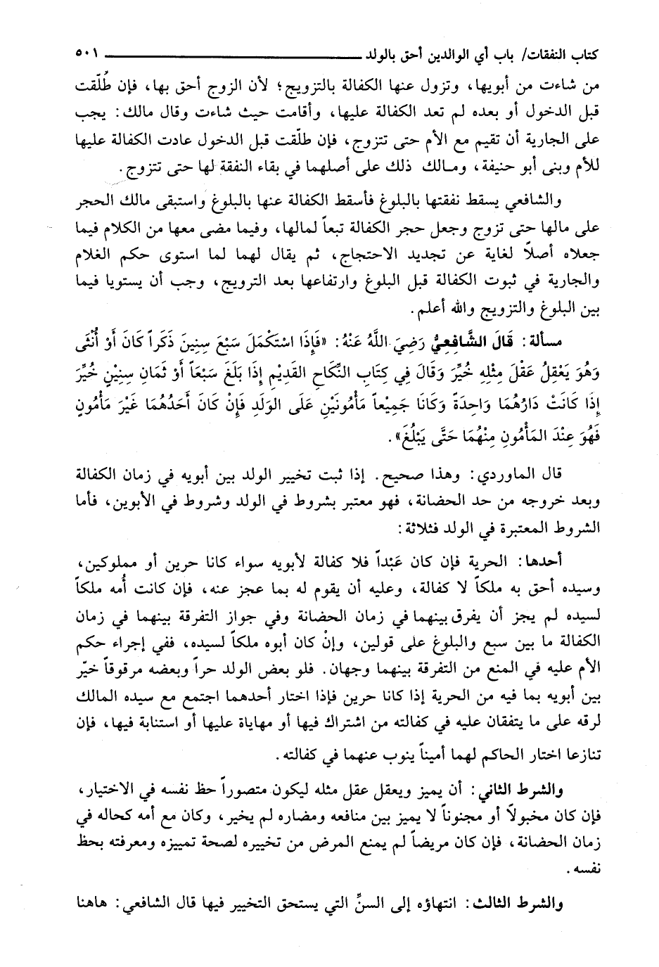 أَحَدُهَا: الْحُرِّيَّةُ فَإِنْ كَانَ عَبْدًا فَلَا كَفَالَةَ لِأَبَوَيْهِ سَوَاءٌ كَانَا حُرَّيْنِ أَوْ مَمْلُوكَيْنِ، وَسَيِّدُهُ أَحَقُّ بِهِ مِلْكًا لَا كَفَالَةً، وَعَلَيْهِ أَنْ يَقُومَ لَهُ بِمَا عَجَزَ عَنْهُ، فَإِنْ كَانَتْ أُمُّهُ مِلْكًا لِسَيِّدِهِ لَمْ يَجُزْ أَنْ يُفَرِّقَ بَيْنَهُمَا فِي زَمَانِ الْحَضَانَةِ وَفِي جَوَازِ التَّفْرِقَةِ بَيْنَهُمَا فِي زَمَانِ الْكَفَالَةِ مَا بَيْنَ سَبْعٍ وَالْبُلُوغِ عَلَى قَوْلَيْنِ، وَإِنْ كَانَ أَبُوهُ مِلْكًا لِسَيِّدِهِ، فَفِي إِجْرَاءِ حُكْمِ الْأُمِّ عَلَيْهِ فِي الْمَنْعِ مِنَ التَّفْرِقَةِ بينهما وجهان. فلو بَعْضُ الْوَلَدِ حُرًّا وَبَعْضُهُ مَرْقُوقًا خُيِّرَ بَيْنَ أَبَوَيْهِ بِمَا فِيهِ مِنَ الْحُرِّيَّةِ إِذَا كَانَا حُرَّيْنِ فَإِذَا اخْتَارَ أَحَدَهُمَا اجْتَمَعَ مَعَ سَيِّدِهِ الْمَالِكِ لِرِقِّهِ عَلَى مَا يَتَّفِقَانِ عَلَيْهِ فِي كفالته من اشتراك فِيهَا أَوْ مُهَايَأَةٍ عَلَيْهَا أَوِ اسْتِنَابَةٍ فِيهَا، فَإِنْ تَنَازَعَا اخْتَارَ الْحَاكِمُ لَهُمَا أَمِينًا يَنُوبُ عَنْهُمَا فِي كَفَالَتِهِ.