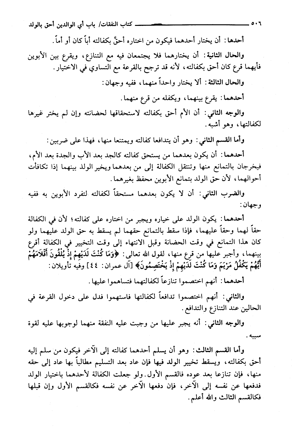 أَحَدُهُمَا: يَكُونُ الْوَلَدُ عَلَى خِيَارِهِ وَيُجْبَرُ مَنِ اخْتَارَهُ عَلَى كَفَالَتِهِ؛ لِأَنَّ فِي الْكَفَالَةِ حَقًّا لَهُمَا وَحَقًّا عَلَيْهِمَا، فَإِذَا سَقَطَ بِالتَّمَانُعِ حَقُّهُمَا لَمْ يُسْقُطْ بِهِ حَقُّ الْوَلَدِ عَلَيْهِمَا وَلَوْ كَانَ هَذَا التَّمَانُعِ فِي وَقْتِ الْحَضَانَةِ وَقَبْلَ الِانْتِهَاءِ إِلَى وَقْتِ التَّخْيِيرِ فِي الْكَفَالَةِ أُقْرِعَ بَيْنَهُمَا، وَأُجْبِرَ عَلَيْهَا مَنْ قَرَعَ مِنْهَا، لِقَوْلِ اللَّهِ تَعَالَى: {وَمَا كُنْتَ لَدَيْهِمْ إِذْ يُلْقُونَ أَقْلامَهُمْ أَيُّهُمْ يَكْفُلُ مَرْيَمَ وَمَا كُنْتَ لَدَيْهِمْ إِذْ يَخْتَصِمُونَ} [آل عمران: 44] وَفِيهِ تَأْوِيلَانِ:
