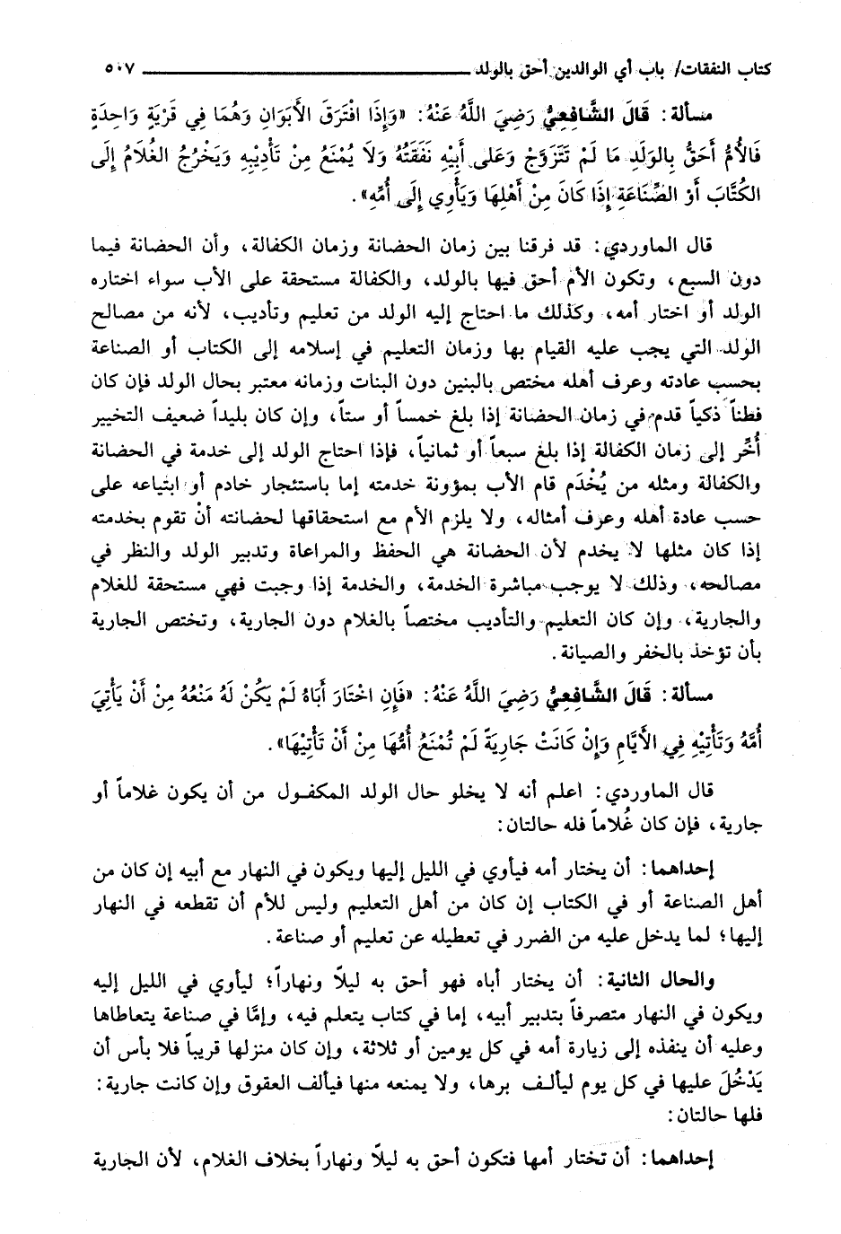 قَالَ الْمَاوَرْدِيُّ: قَدْ فَرَّقْنَا بَيْنَ زَمَانِ الْحَضَانَةِ وَزَمَانِ الْكَفَالَةِ، وَأَنَّ الْحَضَانَةَ فِيمَا دُونَ السَّبْعِ، وَتَكُونُ الْأُمُّ أَحَقَّ فِيهَا بِالْوَلَدِ، وَالْكَفَالَةُ مُسْتَحَقَّةٌ عَلَى الْأَبِ سَوَاءٌ اخْتَارَهُ الْوَلَدُ أَوِ اخْتَارَ أُمَّهُ، وَكَذَلِكَ مَا احْتَاجَ إِلَيْهِ الْوَلَدُ مِنْ تَعْلِيمٍ وَتَأْدِيبٍ، لِأَنَّهُ مِنْ مَصَالِحِ الْوَلَدِ الَّتِي يَجِبُ عَلَيْهِ الْقِيَامُ بِهَا وَزَمَانُ التَّعْلِيمِ فِي إِسْلَامِهِ إِلَى الكتاب أو الصناعة الْوَلَدِ الَّتِي يَجِبُ عَلَيْهِ الْقِيَامُ بِهَا وَزَمَانُ التَّعْلِيمِ فِي إِسْلَامِهِ إِلَى الْكُتَّابِ أَوِ الصِّنَاعَةِ بِحَسْبِ عَادَتِهِ وَعُرْفِ أَهْلِهِ مُخْتَصٌّ بِالْبَنِينَ دُونَ الْبَنَاتِ وَزَمَانُهُ مُعْتَبَرٌ بِحَالِ الْوَلَدِ فَإِنْ كَانَ فَطِنًا ذَكِيًّا قُدِّمَ فِي زَمَانِ الْحَضَّانَةِ إِذَا بَلَغَ خَمْسًا أَوْ سِتًّا، وَإِنْ كَانَ بَلِيدًا ضَعِيفَ التَّخْيِيرِ أُخِّرَ إِلَى زَمَانِ الْكَفَالَةِ إِذَا بَلَغَ سَبْعًا أَوْ ثَمَانِيًا، فَإِذَا احْتَاجَ الْوَلَدُ إِلَى خِدْمَةٍ فِي الْحَضَانَةِ وَالْكَفَالَةِ وَمِثْلُهُ مَنْ يُخْدَمُ قَامَ الْأَبُ بِمَؤُونَةِ خِدْمَتِهِ إِمَّا بِاسْتِئْجَارِ خَادِمٍ أَوِ ابْتِيَاعِهِ عَلَى حَسَبِ عَادَةِ أَهْلِهِ وَعُرْفِ أَمْثَالِهِ، وَلَا يَلْزَمُ الْأُمَّ مَعَ اسْتِحْقَاقِهَا لِحَضَانَتِهِ أَنْ تَقُومَ بِخِدْمَتِهِ إِذَا كَانَ مِثْلُهَا لَا يَخْدِمُ لِأَنَّ الْحَضَانَةَ هِيَ الْحِفْظُ وَالْمُرَاعَاةُ وَتَدْبِيرُ الْوَلَدِ وَالنَّظَرُ فِي مَصَالِحِهِ، وَذَلِكَ لَا يُوجِبُ مُبَاشَرَةَ الْخِدْمَةِ، وَالْخِدْمَةُ إِذَا وَجَبَتْ فَهِيَ مُسْتَحَقَّةٌ لِلْغُلَامِ وَالْجَارِيَةِ، وَإِنْ كَانَ التَّعْلِيمُ وَالتَّأْدِيبُ مُخْتَصَّا بِالْغُلَامِ دُونَ الْجَارِيَةِ، وَتَخْتَصُّ الْجَارِيَةُ بِأَنْ تؤخذ بالخفر والصيانة.