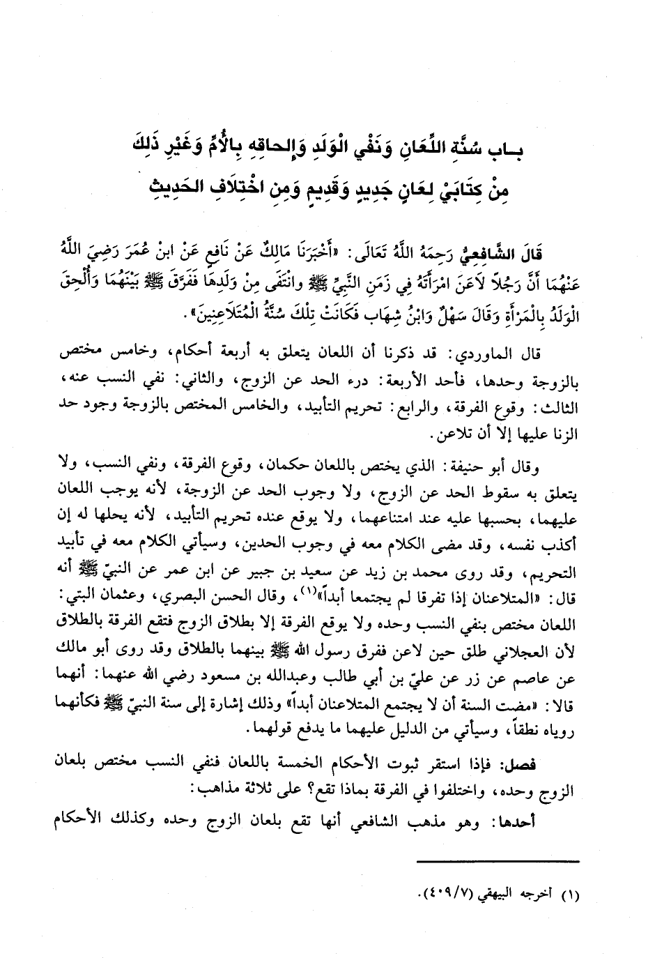 قال الشافعي رحمه الله تعالى: " أَخْبَرَنَا مَالِكٌ عَنْ نَافِعٍ عَنِ ابْنِ عُمَرَ رَضِيَ اللَّهُ عَنْهُمَا أَنَّ رَجُلًا لَاعَنَ امْرَأَتَهُ فِي زَمَنِ النَّبِيِّ - صَلَّى اللَّهُ عَلَيْهِ وَسَلَّم َ - وانتفى من ولدها ففرق - صَلَّى اللَّهُ عَلَيْهِ وَسَلَّم َ - بَيْنَهُمَا وَأَلْحَقَ الْوَلَدَ بِالْمَرْأَةِ وَقَالَ سَهْلٌ وَابْنُ شِهَابٍ فَكَانَتْ تِلْكَ سُنَّةَ الْمُتَلَاعِنَيْنِ ".