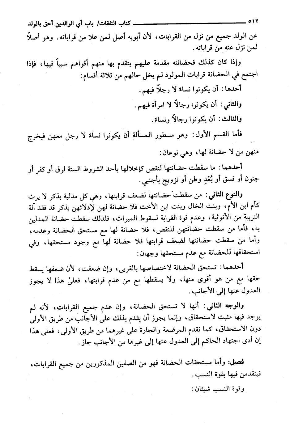 وَالنَّوْعُ الثَّانِي: مَنْ سَقَطَتْ حَضَانَتُهَا لِضَعْفِ قَرَابَتِهَا، وَهِيَ كُلُّ مُدْلِيَةٍ بِذَكَرٍ لَا يَرِثُ كَأُمَّ ابْنِ الْأُمِّ، وَبِنْتِ الْخَالِ وَبِنْتِ ابْنِ الْأُخْتِ فَلَا حَضَانَةَ لَهُنَّ لِإِدْلَائِهِنَّ بِذَكَرٍ قَدْ فَقَدَ آلَةَ التَّرْبِيَةِ مِنَ الْأُنُوثِيَّةِ، وَعَدَمِ قُوَّةِ الْقَرَابَةِ لِسُقُوطِ الْمِيرَاثِ، فَلِذَلِكَ سَقَطَتْ حَضَانَةُ الْمُدْلِينَ بِهِ، فَأَمَّا مَنْ سَقَطَتْ حَضَانَتُهُنَّ لِلنَّقْصِ، فَلَا حَضَانَةَ لَهَا من مُسْتَحِقِّ الْحَضَانَةِ وَعَدَمِهِ، وَأَمَّا مَنْ سَقَطَتْ حَضَانَتُهَا لِضَعْفِ قَرَابَتِهَا فَلَا حَضَانَةَ لَهَا مَعَ وُجُودِ مُسْتَحِقِّهَا، وَفِي اسْتِحْقَاقِهَا لِلْحَضَانَةِ مَعَ عَدَمِ مُسْتَحِقِّهَا وَجْهَانِ: