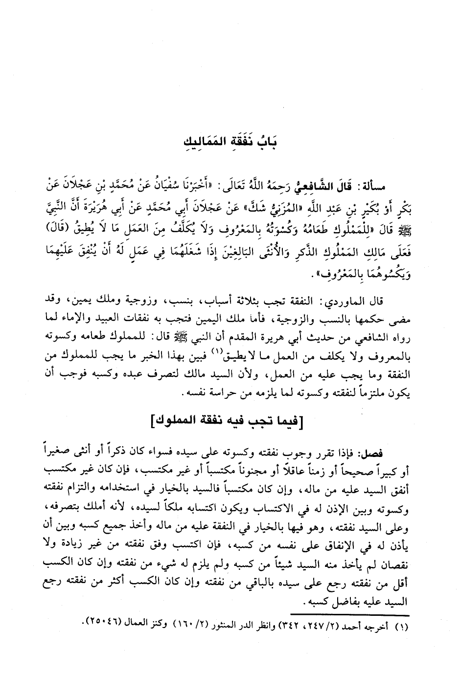قَالَ الشَّافِعِيُّ رَحِمَهُ اللَّهُ تَعَالَى: " أَخْبَرَنَا سُفْيَانُ عَنْ مُحَمَّدِ بْنِ عَجْلَانَ عَنِ بَكْرٍ أَوْ بُكَيْرِ بْنِ عَبْدِ اللَّهِ " الْمُزَنِيُّ شَكَّ " عَنْ عَجْلَانَ أَبِي مُحْمَدٍ عَنْ أَبِي هُرَيْرَةَ أَنَّ النَّبِيَّ - صَلَّى اللَّهُ عَلَيْهِ وَسَلَّم َ - قَالَ " لِلْمَمْلُوكِ طَعَامُهُ وَكِسْوَتُهُ بِالْمَعْرُوفِ وَلَا يُكَلَّفُ مِنَ الْعَمَلِ مَا لَا يُطِيقُ (قَالَ) فَعَلَى مَالِكِ الْمَمْلُوكِ الذَّكَرِ وَالْأُنْثَى الْبَالِغَيْنِ إِذَا شَغَلَهُمَا فِي عَمَلٍ لَهُ أَنْ يُنْفِقَ عَلَيْهِمَا وَيَكْسُوَهُمَا بِالْمَعْرُوفِ ".