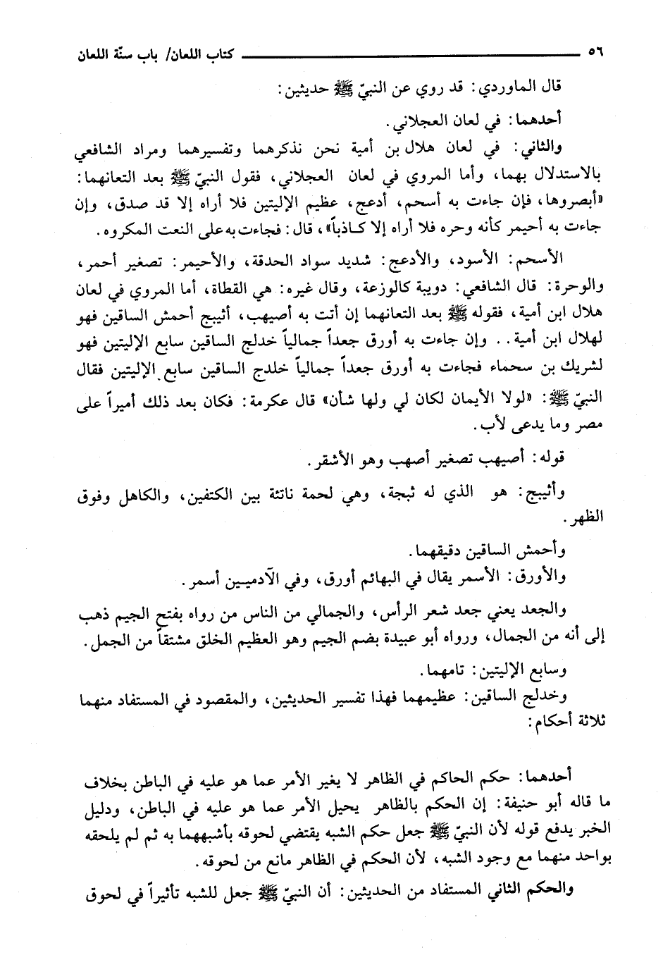 الْأَسْحَمُ: الْأَسْوَدُ، وَالْأَدْعَجُ: شَدِيدُ سَوَادٍ الْحَدَقَةِ، وَالْأُحَيْمِرُ: تَصْغِيرُ أَحْمَرَ، وَالْوَحَرَةُ: قَالَ الشَّافِعِيُّ: دُوَيْبَّةٌ كَالْوَزَعَةِ، وَقَالَ غَيْرُهُ: هِيَ الْقَطَاةُ، أما المروي في لعان هلال ابن أمية، فقوله - صَلَّى اللَّهُ عَلَيْهِ وَسَلَّم َ - بَعْدَ الْتِعَانِهِمَا إِنْ أَتَتْ بِهِ أُصَيْهَبَ، أُثَيْبَجَ أحمش الساقين فهو لهلال ابن أُمَيَّةَ. . وَإِنْ جَاءَتْ بِهِ أَوْرَقَ جَعْدًا جَمَالِيًّا خَدَلَّجَ السَّاقَيْنِ سَابِعَ الْإِلْيَتَيْنِ فَهُوَ لِشَرِيكِ بْنِ سحماء فجاءت به أورق جعداً جمالياً خلدج السَّاقَيْنِ سَابِعَ الْإِلْيَتَيْنِ فَقَالَ النَّبِيُّ - صَلَّى اللَّهُ عَلَيْهِ وَسَلَّم َ -: " لَوْلَا الْأَيْمَانُ لَكَانَ لِي وَلَهَا شَأْنٌ " قَالَ عِكْرِمَةُ: فَكَانَ بَعْدَ ذَلِكَ أَمِيرًا عَلَى مِصْرَ وَمَا يُدْعَى لِأَبٍ.