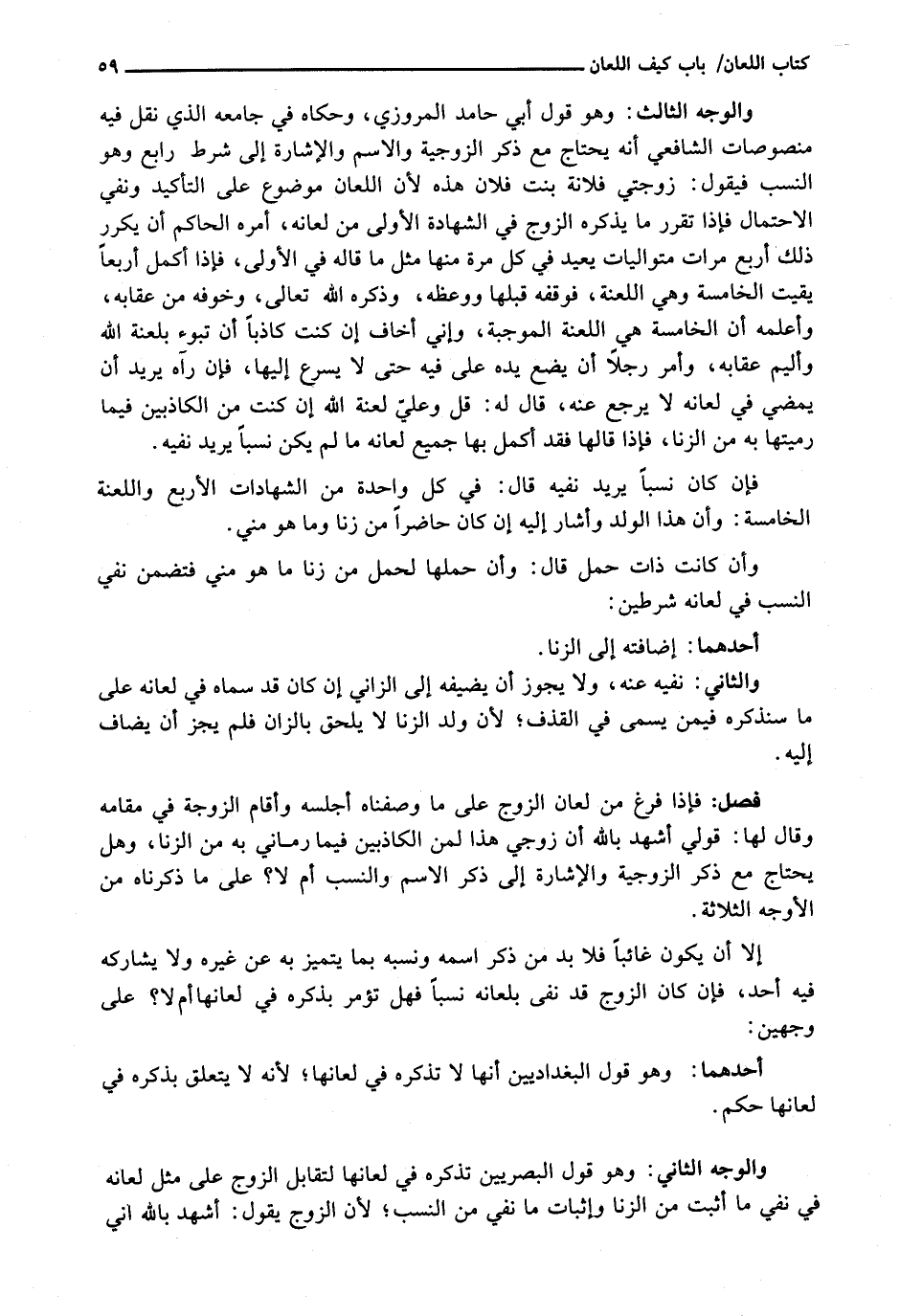 وَالْوَجْهُ الثَّالِثُ: وَهُوَ قَوْلُ أَبِي حَامِدٍ الْمَرْوَزِيِّ، وَحَكَاهُ فِي جَامِعِهِ الَّذِي نَقَلَ فِيهِ مَنْصُوصَاتِ الشَّافِعِيِّ إنَّهُ يَحْتَاجُ مَعَ ذِكْرِ الزَّوْجِيَّةِ وَالِاسْمِ وَالْإِشَارَةِ إِلَى شَرْطٍ رَابِعٍ وَهُوَ النَّسَبُ فَيَقُولُ: زَوْجَتَيْ فُلَانَةُ بِنْتُ فُلَانٍ هَذِهِ لِأَنَّ اللِّعَانَ مَوْضُوعٌ عَلَى التَّأْكِيدِ وَنَفْيِ الِاحْتِمَالِ فَإِذَا تَقَرَّرَ مَا يَذْكُرُهُ الزَّوْجُ فِي الشَّهَادَةِ الْأُولَى مِنْ لِعَانِهِ، أَمَرَهُ الْحَاكِمُ أَنْ يُكَرِّرَ ذَلِكَ أَرْبَعَ مَرَّاتٍ مُتَوَالِيَاتٍ يُعِيدُ فِي كُلِّ مَرَّةٍ مِنْهَا مِثْلَ مَا قَالَهُ فِي الْأُولَى، فَإِذَا أَكْمَلَ أربعاً يقيت الْخَامِسَةُ وَهِيَ اللَّعْنَةُ، فَوَقَفَهُ قَبْلَهَا وَوَعَظَهُ، وَذَكَّرَهُ اللَّهَ تَعَالَى، وَخَوَّفَهُ مِنْ عِقَابِهِ، وَأَعْلَمَهُ أَنَّ الْخَامِسَةَ هِيَ اللَّعْنَةُ الْمُوجِبَةُ، وَإِنِّي أَخَافُ إِنْ كُنْتَ كَاذِبًا أَنْ تَبُوءَ بِلَعْنَةِ اللَّهِ وَأَلِيمِ عِقَابِهِ، وَأَمَرَ رَجُلًا أَنْ يَضَعَ يَدَهُ عَلَى فِيهِ حَتَّى لَا يُسْرِعَ إِلَيْهَا، فَإِنْ رَآهُ يُرِيدُ أَنْ يَمْضِيَ فِي لِعَانِهِ لَا يَرْجِعُ عَنْهُ، قَالَ لَهُ: قُلْ وَعَلَيَّ لَعْنَةُ اللَّهِ إِنْ كُنْتُ مِنَ الْكَاذِبِينَ فِيمَا رَمَيْتُهَا بِهِ مِنَ الزِّنَا، فَإِذَا قَالَهَا فَقَدْ أَكْمَلَ بِهَا جَمِيعَ لِعَانِهِ مَا لَمْ يَكُنْ نَسَبًا يُرِيدُ نَفْيَهُ.