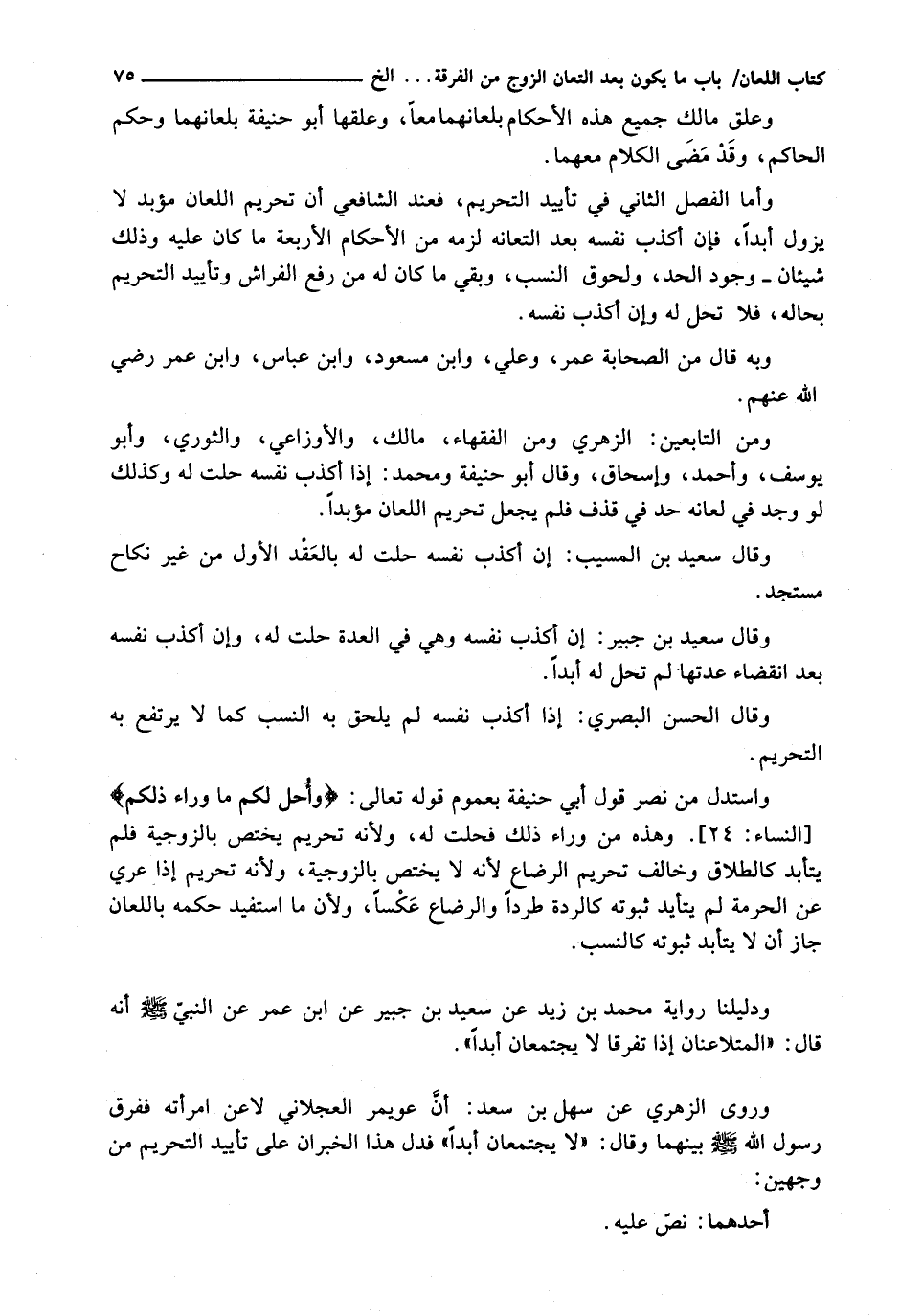 وَرَوَى الزُّهْرِيُّ عَنْ سَهْلِ بْنِ سَعْدٍ: أَنْ عُوَيْمِرَ الْعَجْلَانِيَّ لَاعَنَ امْرَأَتَهُ فَفَرَّقَ رَسُولُ اللَّهِ - صَلَّى اللَّهُ عَلَيْهِ وَسَلَّم َ - بَيْنَهُمَا وَقَالَ: " لَا يَجْتَمِعَانِ أَبَدًا " فَدَلَّ هَذَا الخبران على تأييد التَّحْرِيمِ مِنْ وَجْهَيْنِ: