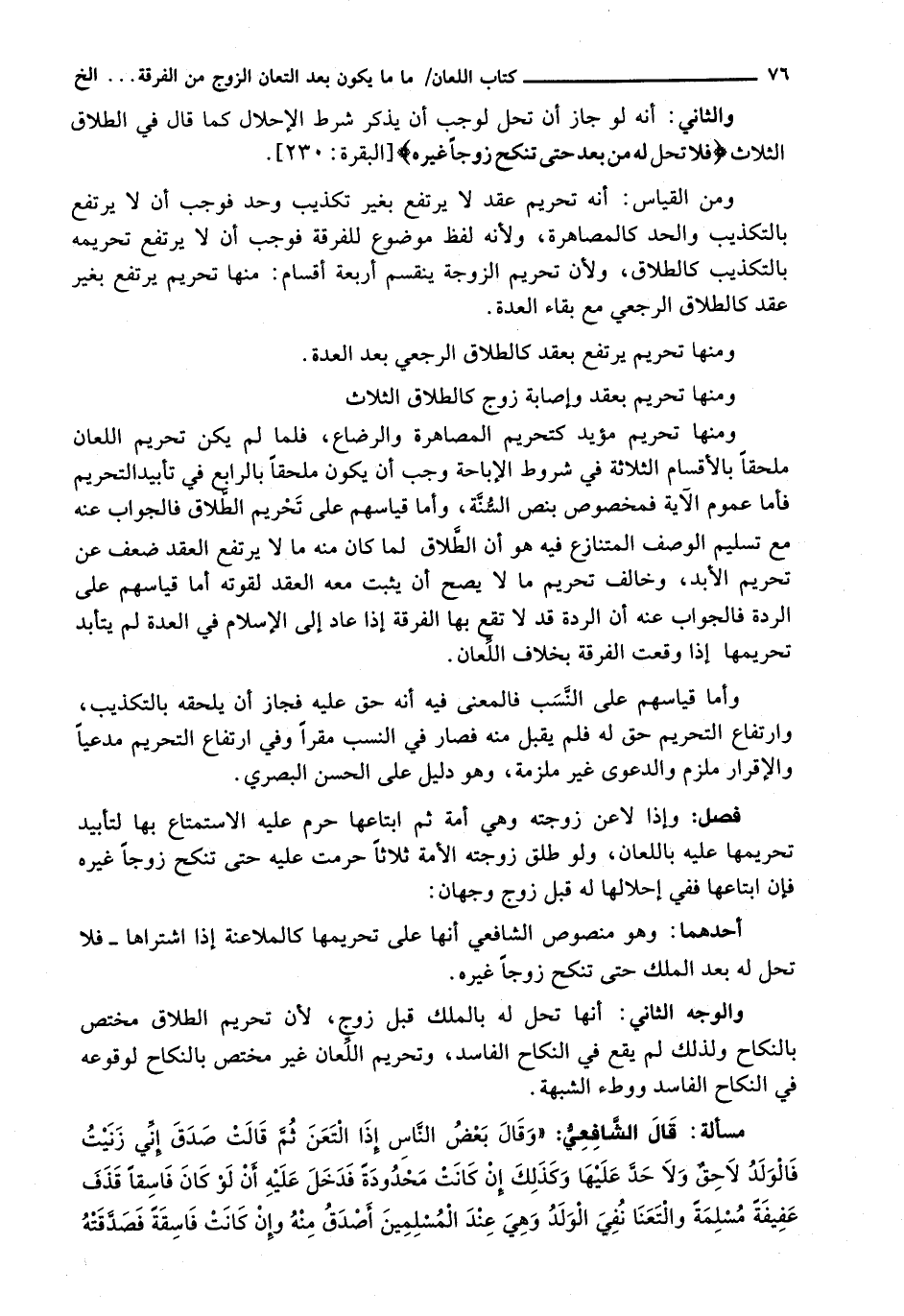 ومنها تحريم مؤيد كَتَحْرِيمِ الْمُصَاهَرَةِ وَالرِّضَاعِ، فَلَمَّا لَمْ يَكُنْ تَحْرِيمُ اللِّعَانِ مُلْحَقًا بِالْأَقْسَامِ الثَّلَاثَةِ فِي شُرُوطِ الْإِبَاحَةِ وَجَبَ أَنْ يَكُونَ مُلْحَقًا بِالرَّابِعِ فِي تَأْبِيدِ التَّحْرِيمِ فَأَمَّا عُمُومُ الْآيَةِ فَمَخْصُوصٌ بِنَصِّ السُّنَّةِ، وَأَمَّا قِيَاسُهُمْ عَلَى تَحْرِيمِ الطَّلَاقِ فَالْجَوَابُ عَنْهُ مَعَ تَسْلِيمِ الْوَصْفِ الْمُتَنَازَعِ فِيهِ هُوَ أَنَّ الطَّلَاقَ لَمَّا كَانَ مِنْهُ مَا لَا يَرْتَفِعُ الْعَقْدُ ضَعُفَ عَنْ تَحْرِيمِ الْأَبَدِ، وَخَالَفَ تَحْرِيمَ مَا لَا يَصِحُّ أَنْ يَثْبُتَ مَعَهُ الْعَقْدُ لِقُوَّتِهِ أَمَّا قِيَاسُهُمْ عَلَى الرِّدَّةِ فَالْجَوَابُ عَنْهُ أَنَّ الرِّدَّةَ قَدْ لَا تَقَعُ بِهَا الْفُرْقَةُ إِذَا عَادَ إِلَى الْإِسْلَامِ فِي الْعِدَّةِ لَمْ يَتَأَبَّدْ تَحْرِيمُهَا إِذَا وَقَعَتِ الْفُرْقَةُ بِخِلَافِ اللِّعَانِ.