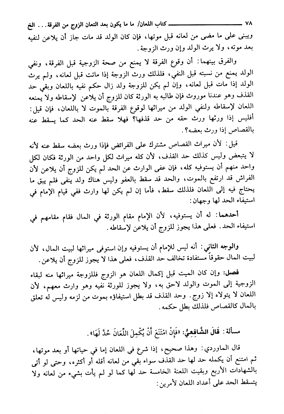 قَالَ الْمَاوَرْدِيُّ: وَهَذَا صَحِيحٌ، إِذَا شَرَعَ فِي اللعان إما في حياتها أبو بَعْدَ مَوْتِهَا، ثُمَّ امْتَنَعَ أَنْ يُكْمِلَهُ حُدَّ لَهَا حَدَّ الْقَذْفِ سَوَاءٌ بَقِيَ مِنْ لِعَانِهِ أَقَلُّهُ أَوْ أَكْثَرُهُ، وَحَتَّى لَوْ أَتَى بِالشَّهَادَاتِ الْأَرْبَعِ وَبَقِيَتِ اللَّعْنَةُ الْخَامِسَةُ حُدَّ لَهَا كَمَا لَوْ لَمْ يَأْتِ بِشَيْءٍ مِنْ لِعَانِهِ وَلَا يتسقط الْحَدُّ عَلَى أَعْدَادِ اللِّعَانِ لِأَمْرَيْنِ: