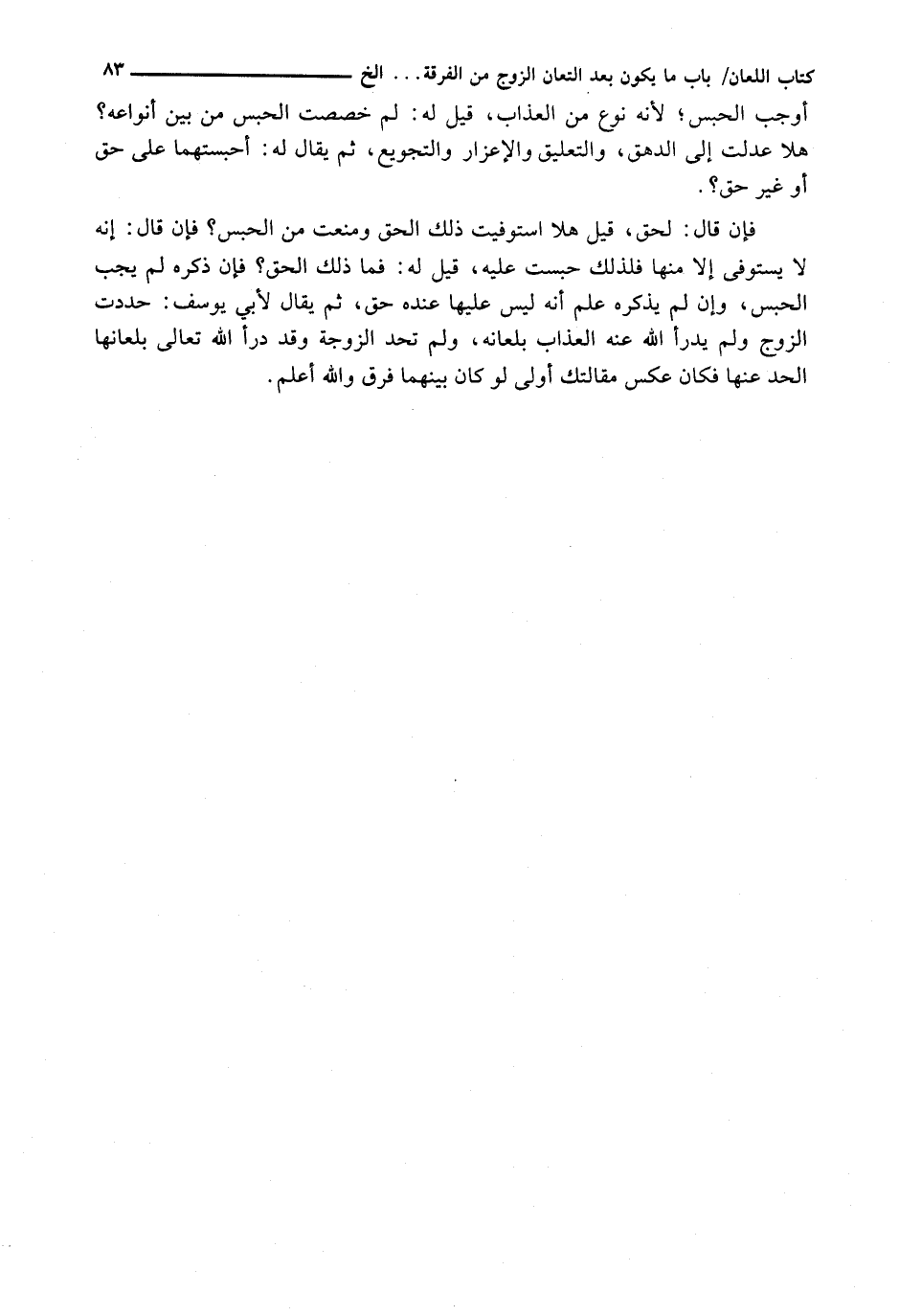 فَإِنْ قَالَ: لِحَقٍّ، قِيلَ هَلَّا اسْتَوْفَيْتَ ذَلِكَ الْحَقَّ وَمَنَعْتَ مِنَ الْحَبْسِ؟ فَإِنْ قَالَ: إِنَّهُ لَا يُسْتَوْفَى إِلَّا مِنْهَا فَلِذَلِكَ حُبِسَتْ عَلَيْهِ، قِيلَ لَهُ: فَمَا ذَلِكَ الْحَقُّ؟ فَإِنْ ذَكَرَهُ لَمْ يَجِبِ الْحَبْسُ، وَإِنْ لَمْ يُذْكُرْهُ عُلِمَ أَنَّهُ لَيْسَ عَلَيْهَا عِنْدَهُ حَقٌّ، ثُمَّ يُقَالُ لِأَبِي يُوسُفَ: حَدَدْتَ الزَّوْجَ وَلَمْ يَدْرَأِ اللَّهُ عَنْهُ الْعَذَابَ بِلِعَانِهِ، وَلَمْ تَحُدَّ الزَّوْجَةَ وَقَدْ دَرَأَ اللَّهُ تَعَالَى بِلِعَانِهَا الْحَدَّ عَنْهَا فَكَانَ عَكْسُ مَقَالَتِكَ أَوْلَى لَوْ كَانَ بَيْنَهُمَا فَرْقٌ وَاللَّهُ أَعْلَمُ.