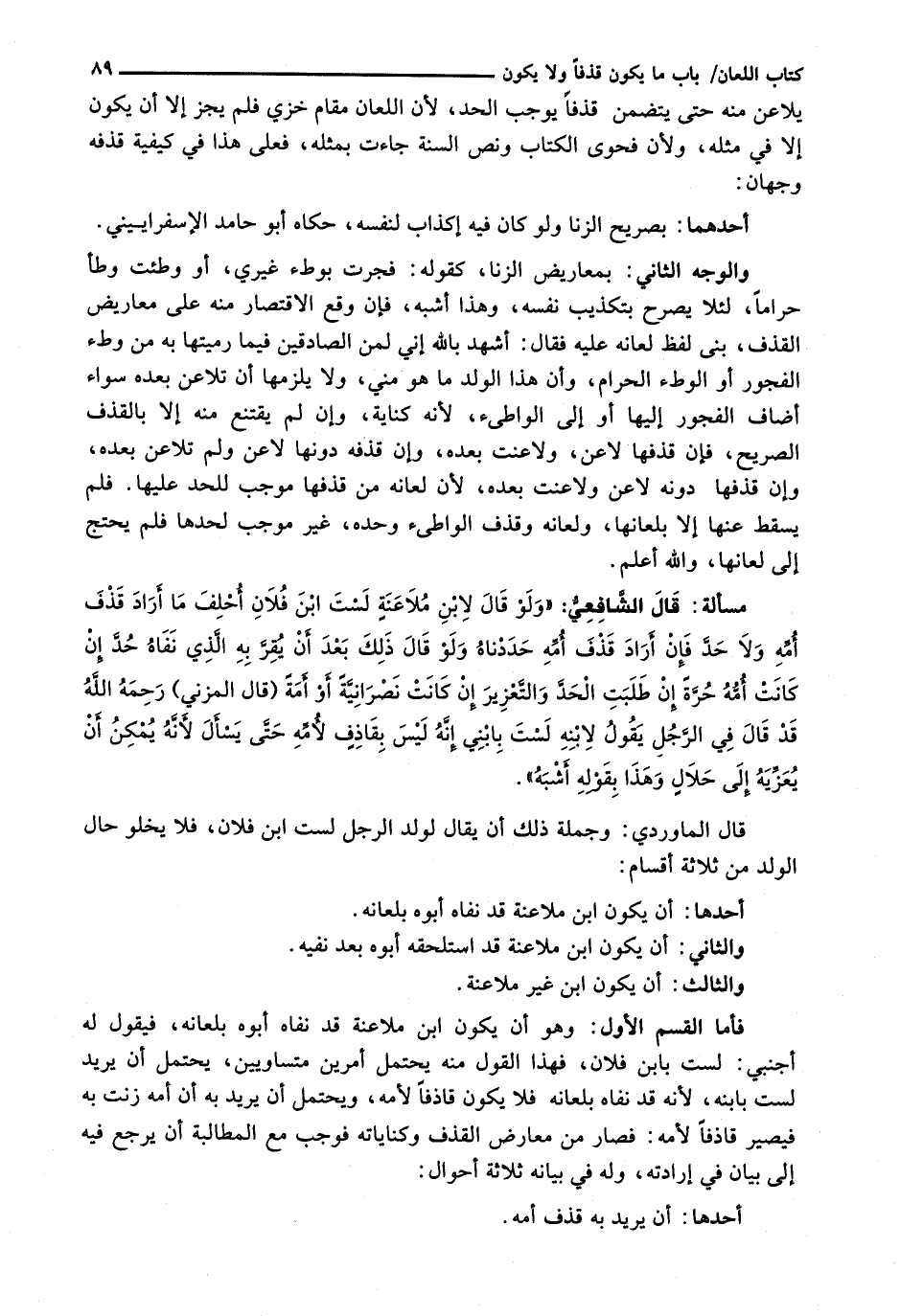 فَأَمَّا الْقِسْمُ الْأَوَّلُ: وَهُوَ أَنْ يَكُونَ ابْنَ مُلَاعَنَةٍ قَدْ نَفَاهُ أَبُوهُ بِلِعَانِهِ، فَيَقُولُ لَهُ أَجْنَبِيٌّ: لَسْتَ بِابْنِ فُلَانٍ، فَهَذَا الْقَوْلُ مِنْهُ يَحْتَمِلُ أَمْرَيْنِ مُتَسَاوِيَيْنِ، يُحْتَمَلُ أَنْ يُرِيدَ لَسْتَ بِابْنِهِ، لِأَنَّهُ قَدْ نَفَاهُ بِلِعَانِهِ فَلَا يَكُونُ قَاذِفًا لِأُمِّهِ، وَيُحْتَمَلُ أَنْ يُرِيدَ بِهِ أَنَّ أُمَّهُ زَنَتْ بِهِ فَيَصِيرُ قَاذِفًا لِأُمِّهِ: فَصَارَ مِنْ مَعَارِضِ الْقَذْفِ وَكِنَايَاتِهِ فَوَجَبَ مَعَ الْمُطَالَبَةِ أَنْ يَرْجِعَ فِيهِ إِلَى بَيَانٍ فِي إِرَادَتِهِ، وَلَهُ فِي بَيَانِهِ ثَلَاثة أَحْوَالٍ: