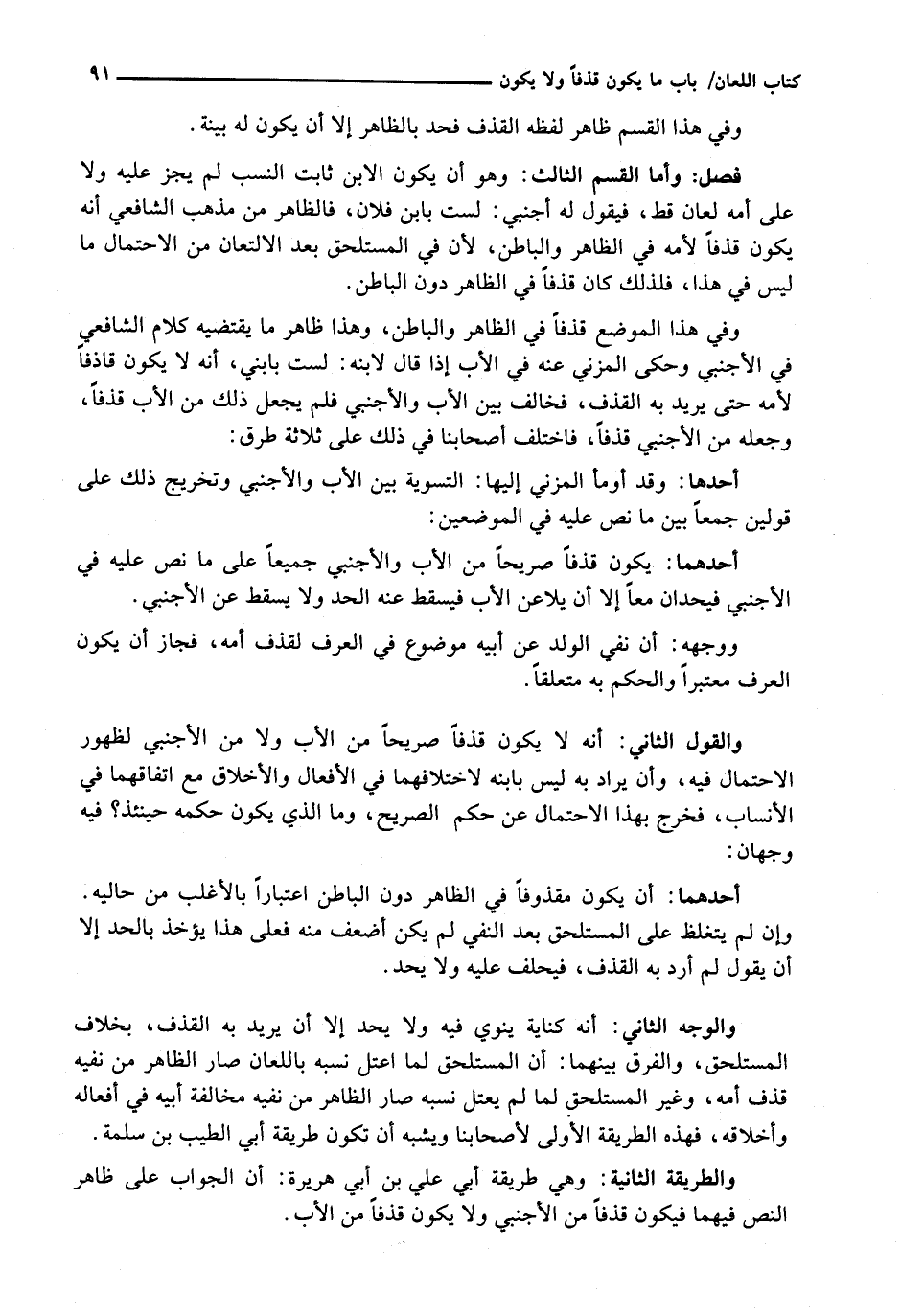 وَالْوَجْهُ الثَّانِي: أَنَّهُ كِنَايَةٌ يَنْوِي فِيهِ وَلَا يُحَدُّ إِلَّا أَنْ يُرِيدَ بِهِ الْقَذْفَ، بِخِلَافِ الْمُسْتَلْحِقِ، وَالْفَرْقُ بَيْنَهُمَا: أَنَّ الْمُسْتَلْحِقَ لَمَّا اعْتَلَّ نَسَبُهُ بِاللِّعَانِ صَارَ الظَّاهِرُ مِنْ نَفْيِهِ قَذْفَ أُمِّهِ، وَغَيْرُ الْمُسْتَلْحِقِ لَمَّا لَمْ يَعْتَلَّ نَسَبُهُ صَارَ الظَّاهِرُ مَنْ نَفْيِهِ مُخَالَفَةَ أَبِيهِ فِي أَفْعَالِهِ وَأَخْلَاقِهِ، فَهَذِهِ الطَّرِيقَةُ الْأُولَى لِأَصْحَابِنَا وَيُشْبِهُ أَنْ تَكُونَ طَرِيقَةَ أَبِي الطَّيِّبِ بْنِ سَلَمَةَ.
