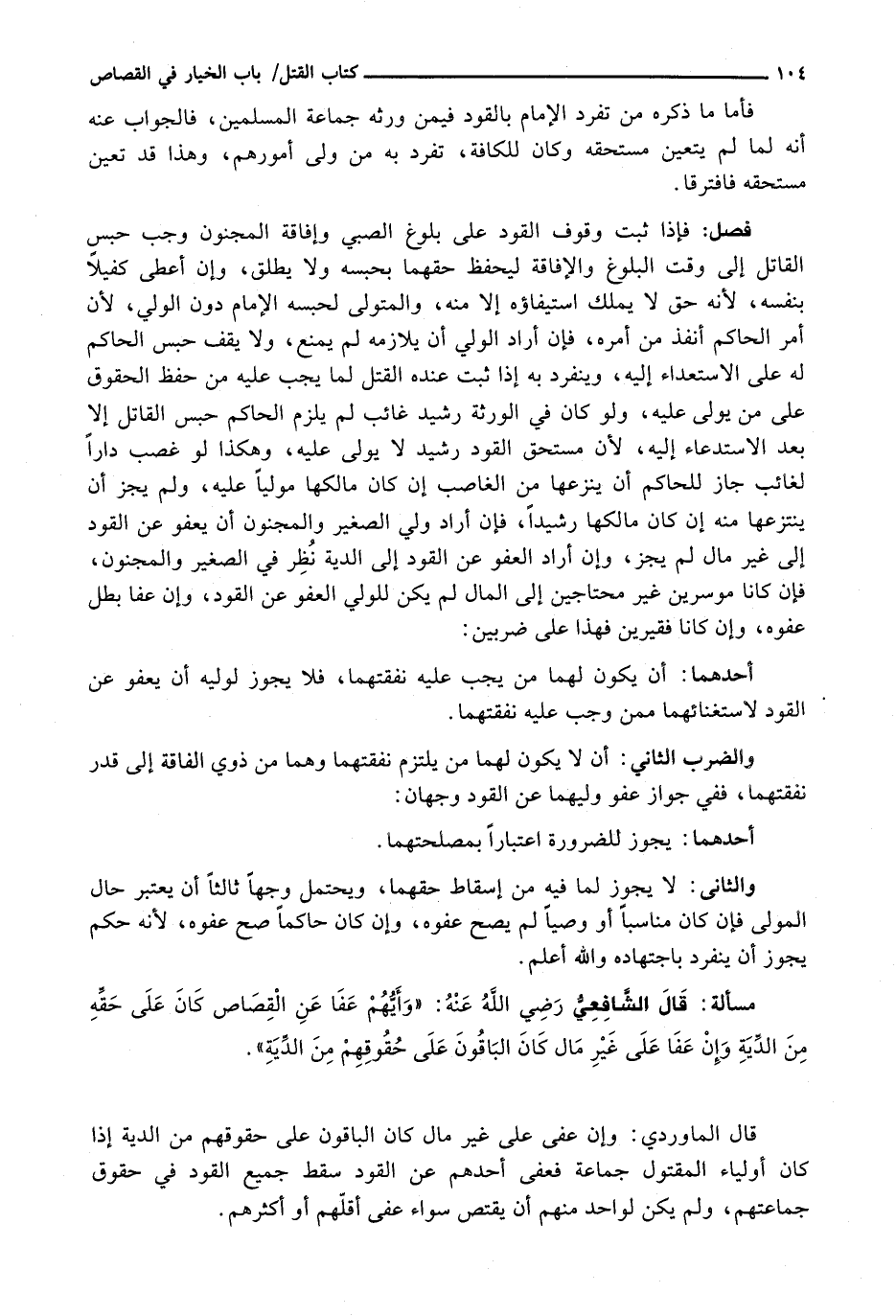 فَإِذَا ثَبَتَ وُقُوفُ الْقَوَدِ عَلَى بُلُوغِ الصَّبِيِّ وَإِفَاقَةِ الْمَجْنُونِ وَجَبَ حَبْسُ الْقَاتِلِ إِلَى وَقْتِ الْبُلُوغِ وَالْإِفَاقَةِ لِيُحْفَظَ حَقُّهُمَا بِحَبْسِهِ وَلَا يُطْلَقُ، وَإِنْ أَعْطَى كَفِيلًا بِنَفْسِهِ، لِأَنَّهُ حَقٌّ لَا يُمْلَكُ اسْتِيفَاؤُهُ إِلَّا مِنْهُ، وَالْمُتَوَلِّي لِحَبْسِهِ الْإِمَامُ دُونَ الْوَلِيِّ، لِأَنَّ أَمْرَ الْحَاكِمِ أَنْفَذُ مِنْ أَمْرِهِ، فَإِنْ أَرَادَ الْوَلِيُّ أَنْ يُلَازِمَهُ لَمْ يُمْنَعْ، وَلَا يَقِفُ حَبْسُ الْحَاكِمِ لَهُ عَلَى الِاسْتِعْدَاءِ إِلَيْهِ، وَيَنْفَرِدُ بِهِ إِذَا ثَبَتَ عِنْدَهُ الْقَتْلُ لِمَا يَجِبُ عَلَيْهِ مِنْ حِفْظِ الْحُقُوقِ عَلَى مَنْ يُوَلَّى عَلَيْهِ، وَلَوْ كَانَ فِي الْوَرَثَةِ رَشِيدٌ غَائِبٌ لَمْ يلزم الحاكم حبس القاتل إلا بعد الاستدعاء إِلَيْهِ، لِأَنَّ مُسْتَحِقَّ الْقَوَدِ رَشِيدٌ لَا يُوَلَّى عَلَيْهِ، وَهَكَذَا لَوْ غَصَبَ دَارًا لِغَائِبٍ جَازَ لِلْحَاكِمِ أَنْ يَنْزِعَهَا مِنَ الغَاصِبِ إِنْ كَانَ مَالِكُهَا مُوَلِّيًا عَلَيْهِ، وَلَمْ يَجُزْ أَنْ يَنْتَزِعَهَا مِنْهُ إِنْ كَانَ مَالِكُهَا رَشِيدًا، فَإِنْ أَرَادَ وَلِيُّ الصَّغِيرِ وَالْمَجْنُونِ أَنْ يَعْفُوَ عَنِ الْقَوَدِ إِلَى غَيْرِ مَالٍ لَمْ يَجُزْ، وَإِنْ أَرَادَ الْعَفْوَ عَنِ الْقَوَدِ إِلَى الدِّيَةِ نُظِرَ فِي الصَّغِيرِ وَالْمَجْنُونِ، فَإِنْ كَانَا مُوسِرَيْنِ غَيْرَ مُحْتَاجَيْنِ إِلَى الْمَالِ لَمْ يَكُنْ لِلْوَلِيِّ الْعَفْوُ عَنِ الْقَوَدِ، وَإِنْ عَفَا بَطَلَ عَفْوُهُ، وَإِنْ كَانَا فَقِيرَيْنِ فَهَذَا عَلَى ضَرْبَيْنِ: