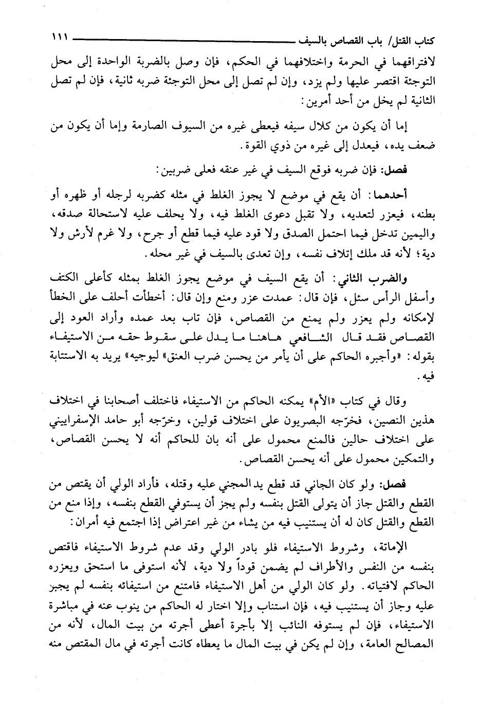 الْإِمَاتَةُ، وَشُرُوطُ الِاسْتِيفَاءِ فَلَوْ بَادَرَ الْوَلِيُّ وَقَدْ عَدِمَ شُرُوطَ الِاسْتِيفَاءِ فَاقْتَصَّ بِنَفْسِهِ مِنَ النَّفْسِ وَالْأَطْرَافِ لَمْ يُضْمَنْ قَوَدًا وَلَا دِيَةً، لِأَنَّهُ اسْتَوْفَى ما استحق ويعزره الحاكم لافتياته. وَلَوْ كَانَ الْوَلِيُّ مِنْ أَهْلِ الِاسْتِيفَاءِ فَامْتَنَعَ مِنَ اسْتِيفَائِهِ بِنَفْسِهِ لَمْ يُجْبَرْ عَلَيْهِ وَجَازَ أَنْ يَسْتَنِيبَ فِيهِ، فَإِنِ اسْتَنَابَ وَإِلَّا اخْتَارَ لَهُ الْحَاكِمُ مَنْ يَنُوبُ عَنْهُ فِي مُبَاشَرَةِ الِاسْتِيفَاءِ، فَإِنْ لَمْ يَسْتَوْفِهِ النَّائِبُ إِلَّا بِأُجْرَةٍ أُعْطِيَ أُجْرَتَهُ مِنْ بَيْتِ الْمَالِ، لِأَنَّهُ مِنَ المَصَالِحِ الْعَامَّةِ، وَإِنْ لَمْ يَكُنْ فِي بَيْتِ الْمَالِ مَا يُعْطَاهُ كَانَتْ أُجْرَتُهُ فِي مَالِ المقتص منه