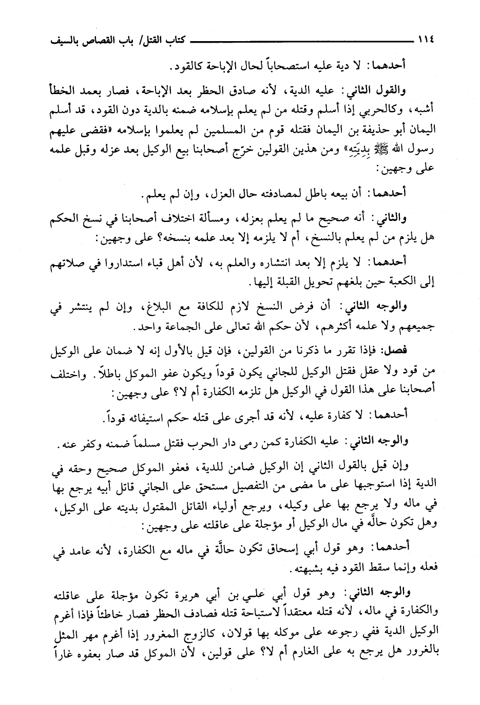 وَالْقَوْلُ الثَّانِي: عَلَيْهِ الدِّيَةُ، لِأَنَّهُ صَادِقُ الْحَظْرِ بَعْدَ الْإِبَاحَةِ، فَصَارَ بِعَمْدِ الْخَطَأِ أَشْبَهَ، وَكَالْحَرْبِيِّ إِذَا أَسْلَمَ وَقَتَلَهُ مَنْ لَمْ يَعْلَمْ بِإِسْلَامِهِ ضَمِنَهُ بِالدِّيَةِ دُونَ الْقَوَدِ، قَدْ أَسْلَمَ الْيَمَانُ أَبُو حُذَيْفَةَ بْنُ الْيَمَانِ فَقَتَلَهُ قَوْمٌ مِنَ المُسْلِمِينَ لَمْ يَعْلَمُوا بِإِسْلَامِهِ " فَقَضَى عَلَيْهِمْ رسول الله - صَلَّى اللَّهُ عَلَيْهِ وَسَلَّم َ - بِدِيَتِهِ " وَمِنْ هَذَيْنِ الْقَوْلَيْنِ خَرَّجَ أَصْحَابُنَا بَيْعَ الْوَكِيلِ بَعْدَ عَزْلِهِ وَقَبْلَ عِلْمِهِ عَلَى وَجْهَيْنِ: