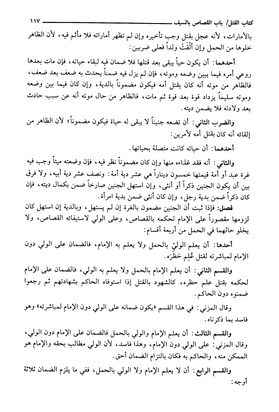 فَإِذَا ثَبَتَ أَنَّ الْجَنِينَ مَضْمُونٌ بِالْغُرَّةِ إِنْ لَمْ يَسْتَهِلَّ، وَبِالدِّيَةِ إِنِ اسْتَهَلَّ كَانَ لُزُومُهَا مَقْصُورًا عَلَى الْإِمَامِ لحكمه بالقصاص، وعلى الوليد لِاسْتِيفَائِهِ الْقِصَاصَ، وَلَا يَخْلُو حَالُهُمَا فِي الْحَمْلِ مِنْ أَرْبَعَةِ أَقْسَامٍ: