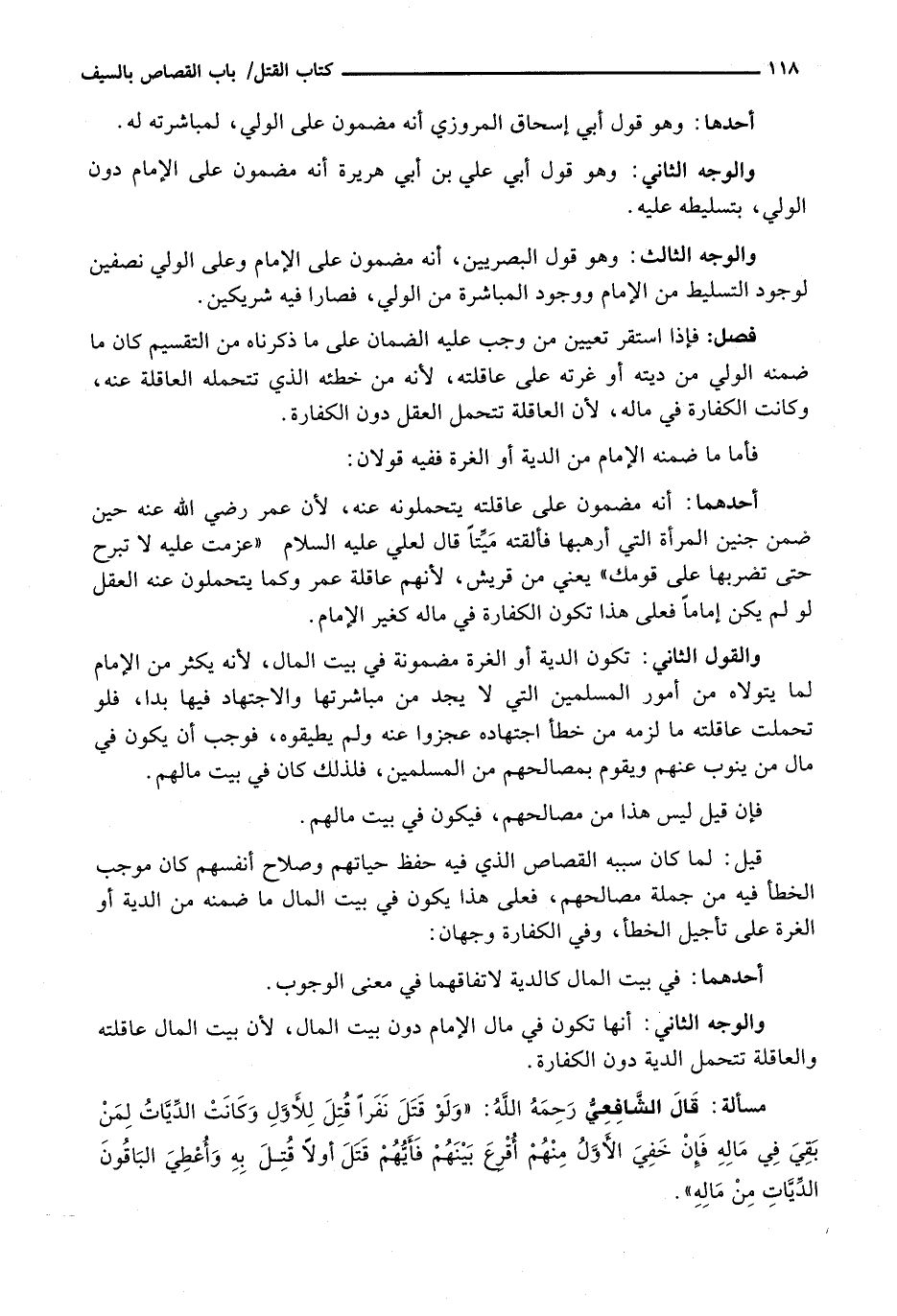 وَالْقَوْلُ الثَّانِي: تَكُونُ الدِّيَةُ أَوِ الْغُرَّةُ مَضْمُونَةً فِي بَيْتِ الْمَالِ، لِأَنَّهُ يَكْثُرُ مِنَ الإِمَامِ لِمَا يَتَوَلَّاهُ مِنْ أُمُورِ الْمُسْلِمِينَ الَّتِي لَا يَجِدُ مِنْ مُبَاشَرَتِهَا وَالِاجْتِهَادِ فِيهَا بُدًّا، فَلَوْ تَحَمَّلَتْ عَاقِلَتُهُ مَا لَزِمَهُ مِنْ خَطَأِ اجْتِهَادِهِ عَجَزُوا عَنْهُ وَلَمْ يُطِيقُوهُ، فَوَجَبَ أَنْ يَكُونَ فِي مَالِ مَنْ يَنُوبُ عَنْهُمْ وَيَقُومُ بِمَصَالِحِهِمْ مِنَ المُسْلِمِينَ، فَلِذَلِكَ كَانَ فِي بَيْتِ مَالِهِمْ.