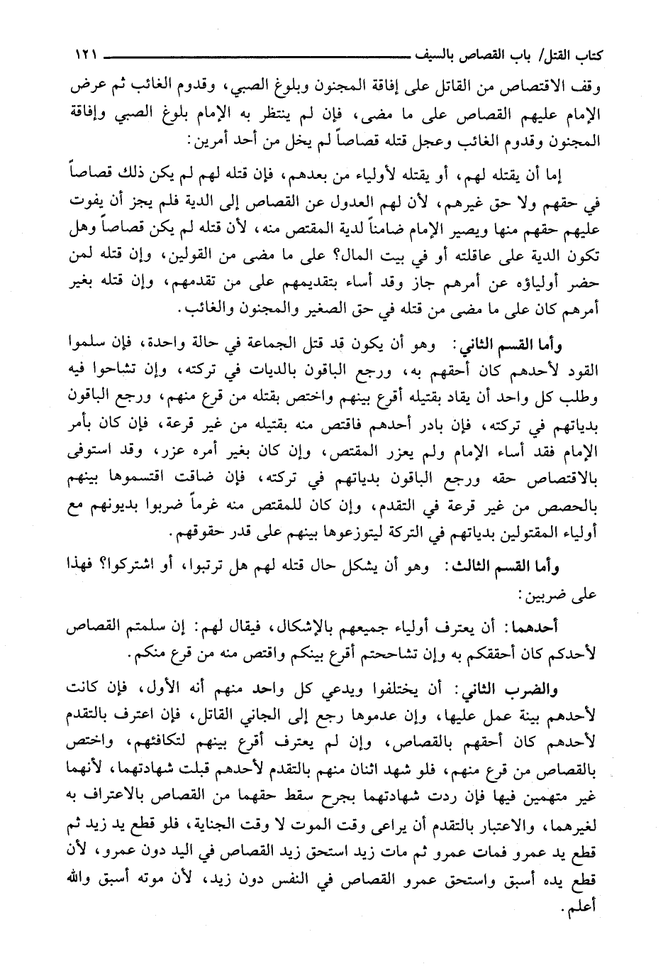 وَقَفَ الِاقْتِصَاصُ مِنَ القَاتِلِ عَلَى إِفَاقَةِ الْمَجْنُونِ وَبُلُوغِ الصَّبِيِّ، وَقُدُومِ الْغَائِبِ ثُمَّ عَرَضَ الْإِمَامُ عَلَيْهِمِ الْقِصَاصَ عَلَى مَا مَضَى، فَإِنْ لَمْ يَنْتَظِرْ بِهِ الْإِمَامُ بُلُوغَ الصَّبِيِّ وَإِفَاقَةَ الْمَجْنُونِ وَقُدُومَ الْغَائِبِ وَعَجَّلَ قَتْلَهُ قِصَاصًا لَمْ يَخْلُ مِنْ أَحَدِ أَمْرَيْنِ: